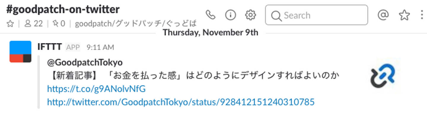 「Goodpatch」「グッドパッチ」「ぐっどぱっち」というワードが含まれるツイートを拾って、自動で共有されるチャンネルです。