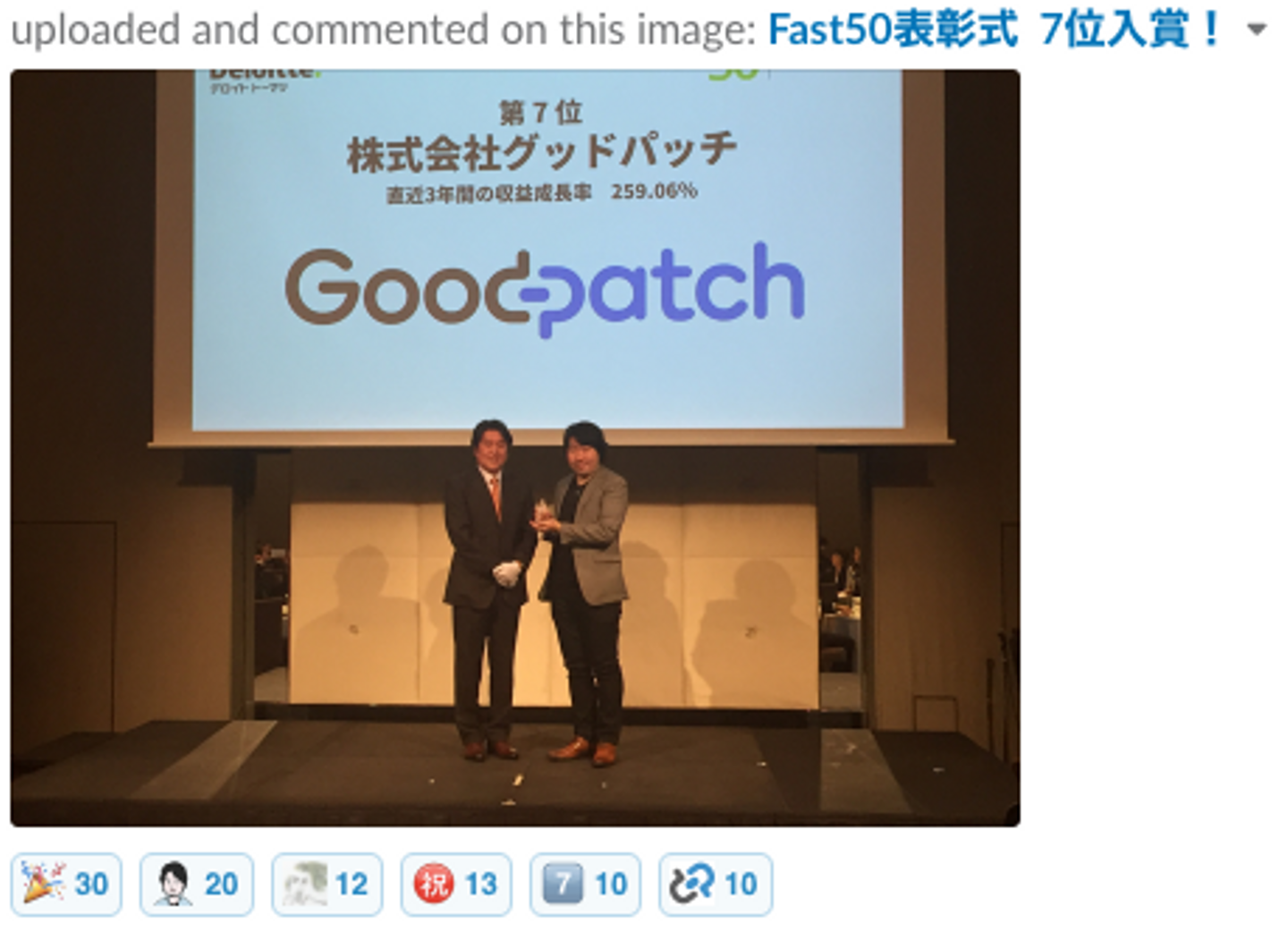 会社として表彰されたニュースがシェアされた時には、やはり会社のロゴマークが活躍します。先日発表された日本テクノロジー Fast50での7位発表の投稿にも、ロゴマークが輝いていました!