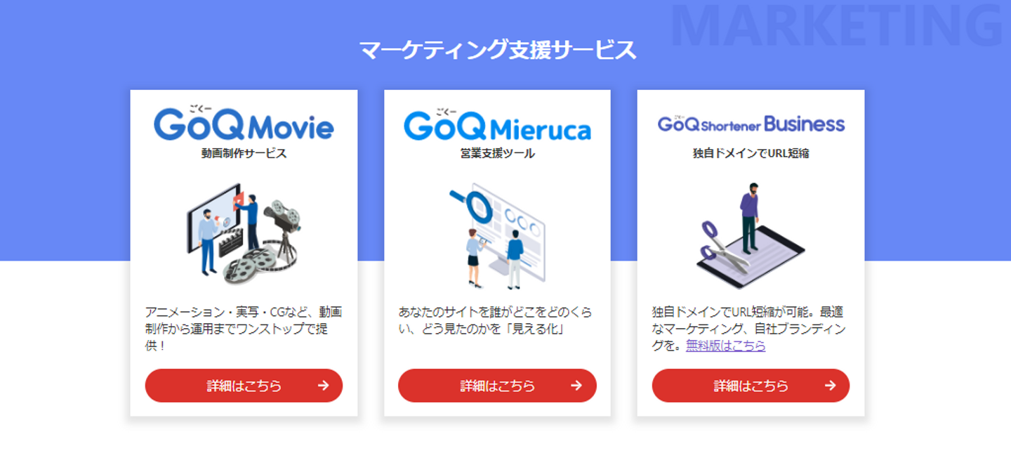 アニメーション・実写・CGなど動画制作から運用までワンストップで提供するツール「GoQMovie」、自社のサイトを誰がどこをどのくらいどのように見たのかを可視化するツール「GoQMieruka」、独自ドメインでURLを短縮し最適なマーケティングや自社ブランディングを促進するサービス「GoQShortener」をご提供しています。