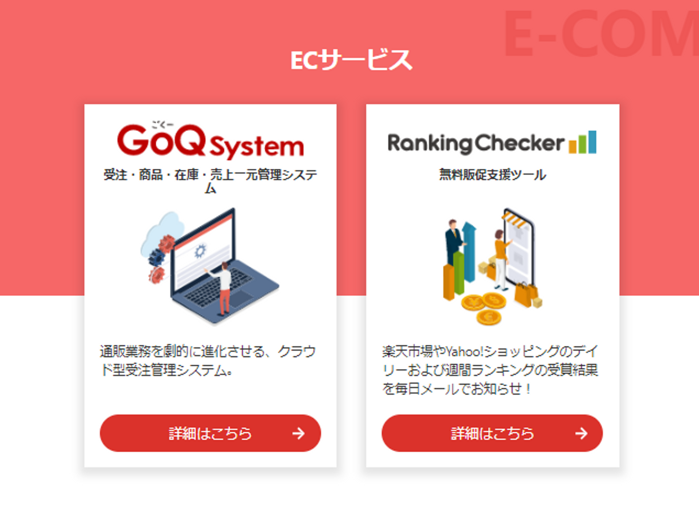 受注・商品・在庫・売上を一元管理できるシステム「GoQSystem」、楽天市場やYahoo!ショッピングのデイリーおよび週間ランキングの受賞結果を定期的に知ることが出来る販促支援ツールなどをご提供しています。