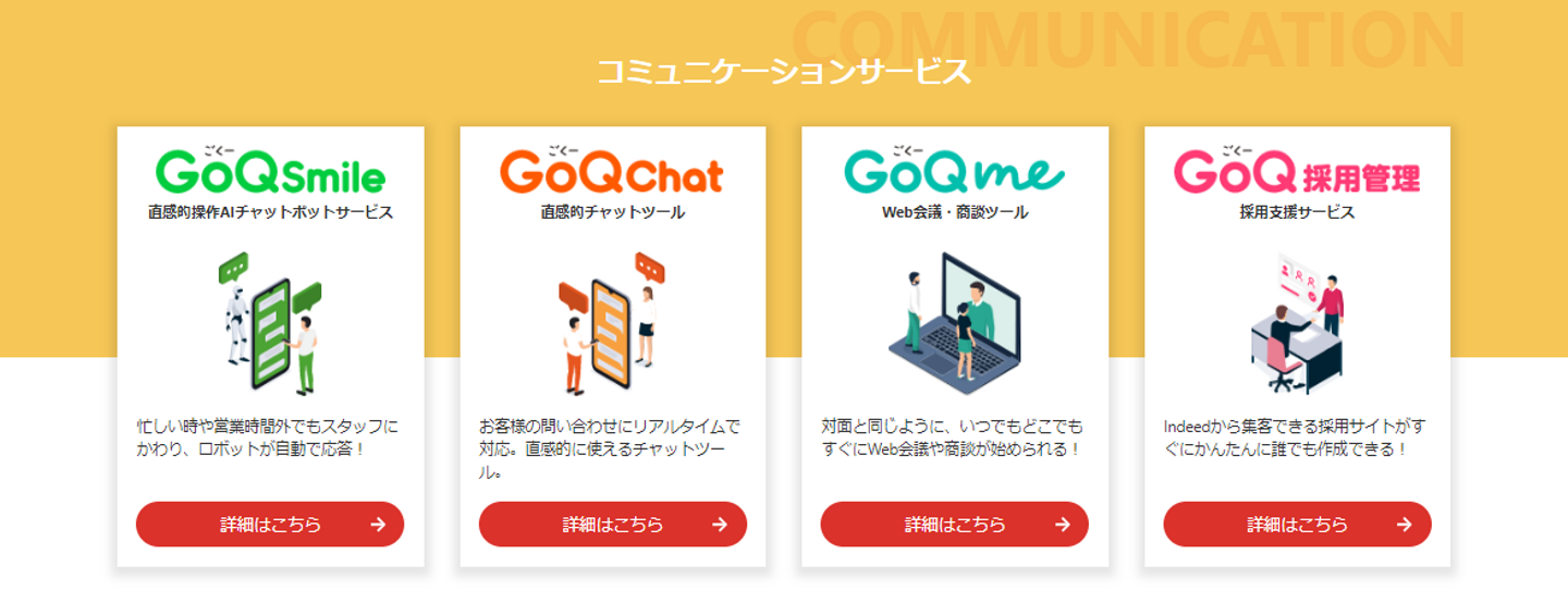 忙しい時や営業時間外でもスタッフの代わりにロボットが自動で応答するシステム「GoQSmile」、お客様の問い合わせにリアルタイムで対応でき直感的に使えるチャットツール「GoQChat」、対面と同じようにいつでもどこでもすぐにWeb会議や商談が始められるツール「GoQme」、Indeedから集客できる採用サイトがすぐに簡単に誰でも作成できるツール「GoQ採用管理」 をご提供しています。