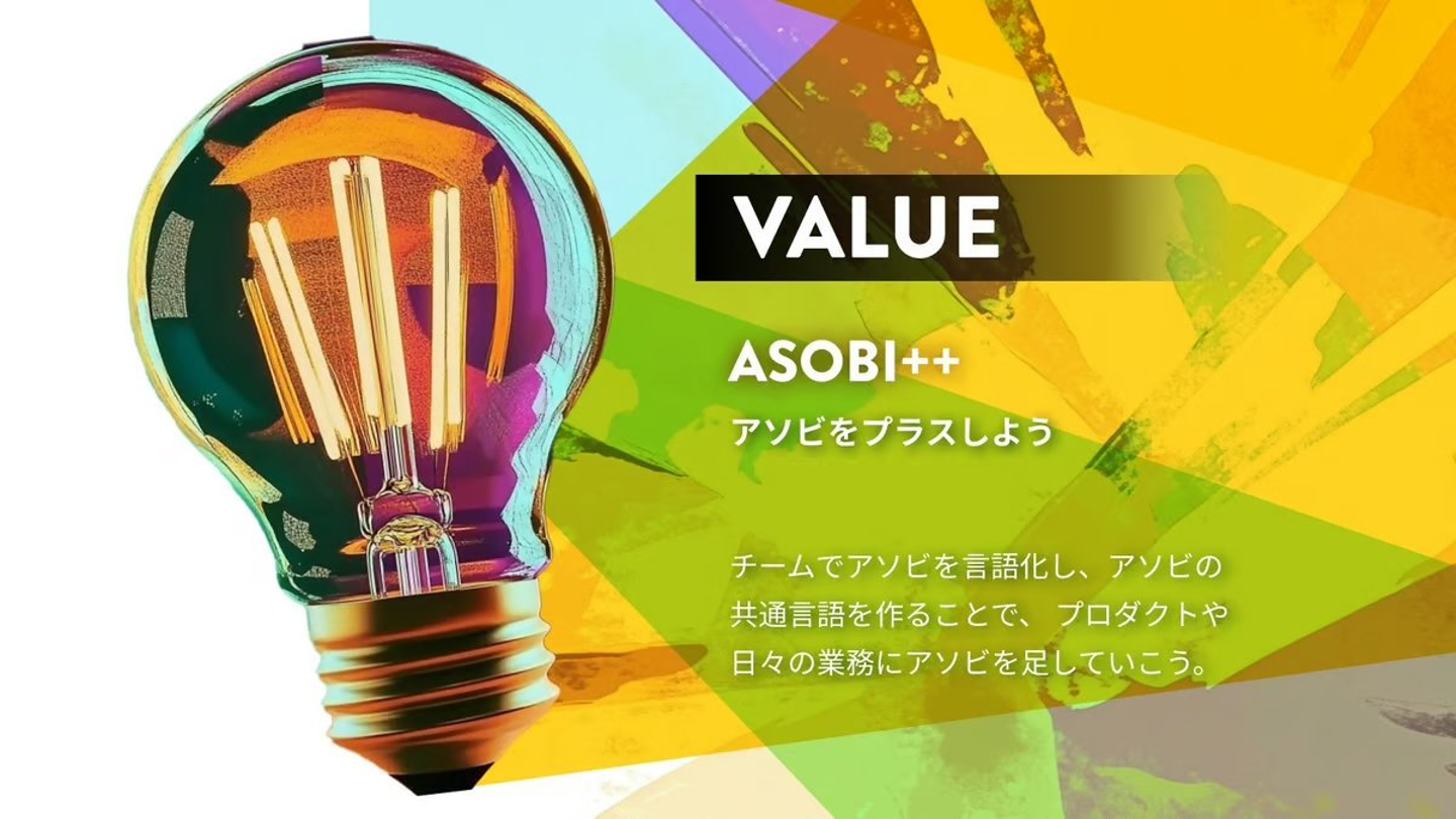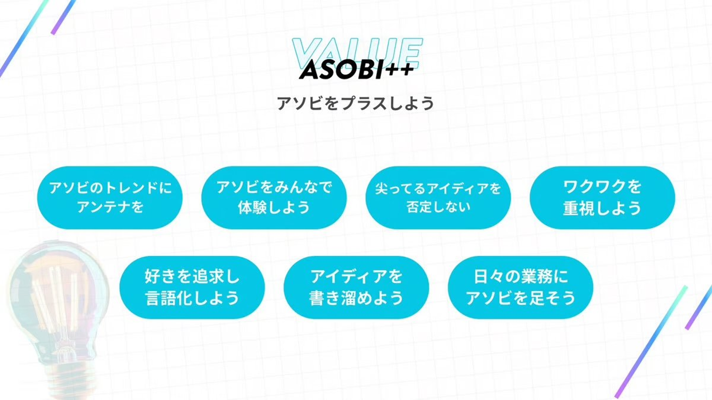 Graffityはバリューをアップデートし、「ASOBI++(アソビプラス)」が加わりました。新バリューには「アソビを言語化し、アソビの言語を作り、アソビを加えていく」という思いが込められています。