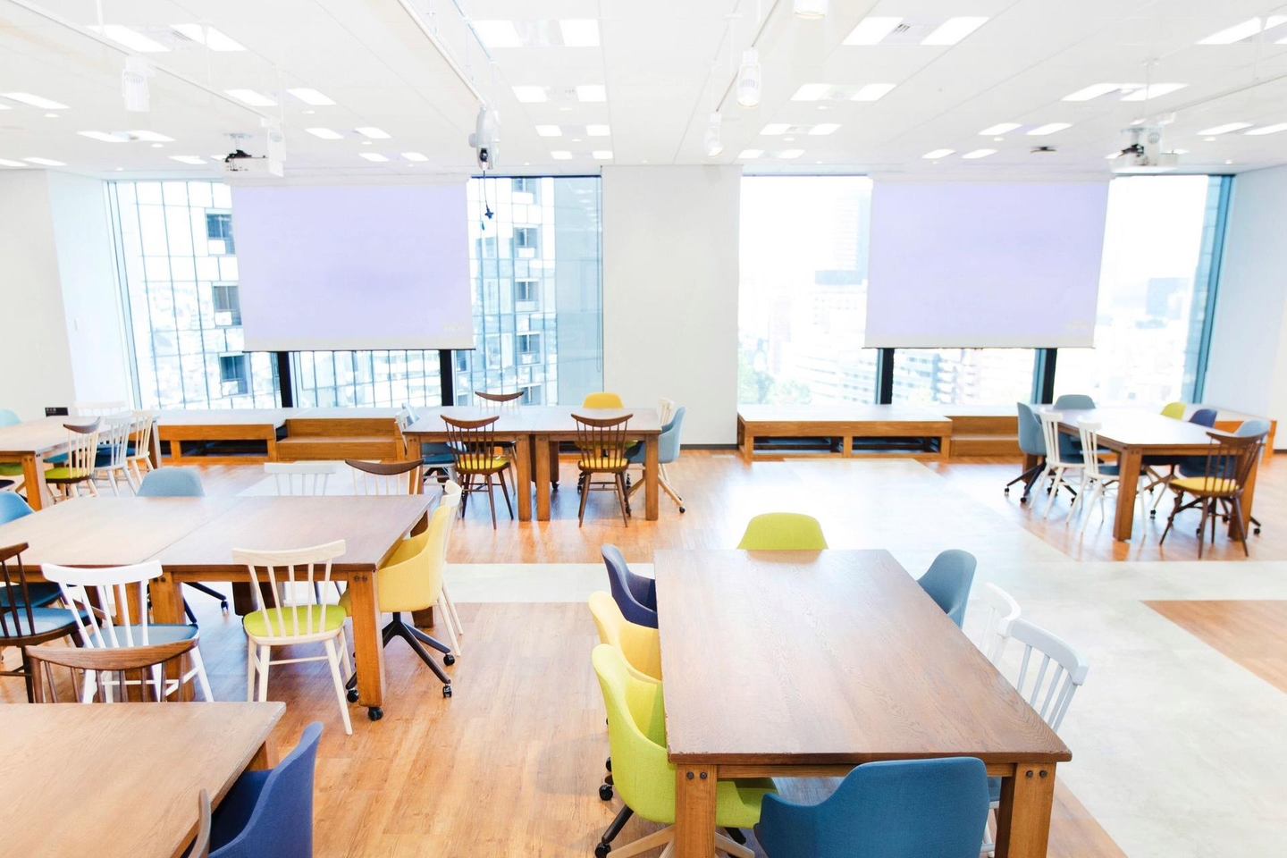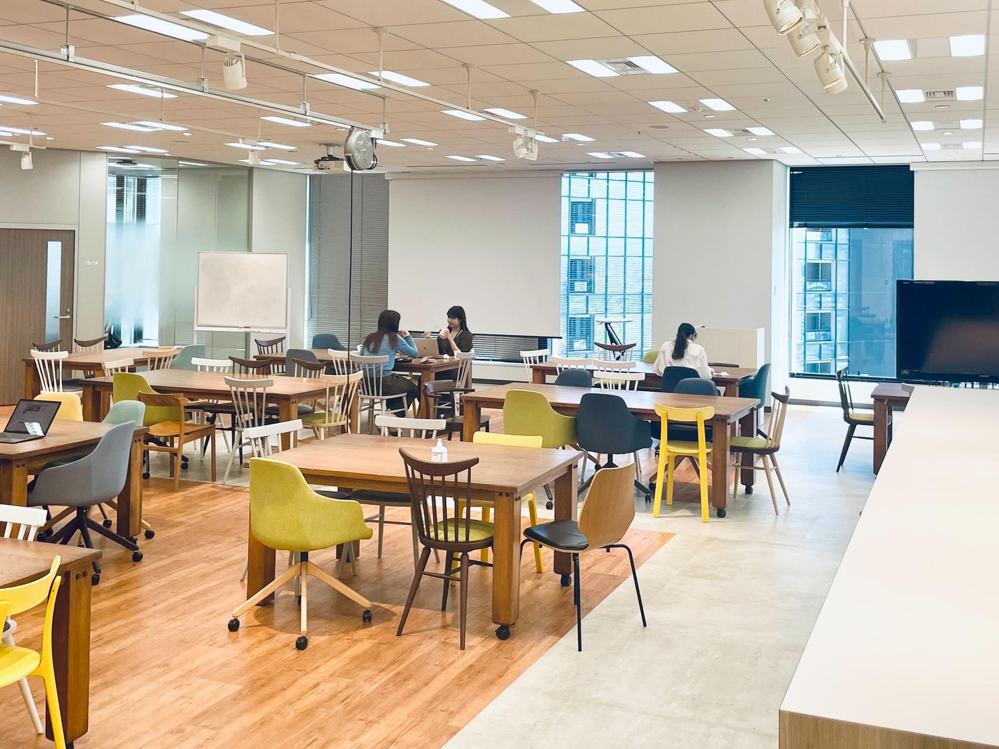 人が集まりやすく、社員同士のコミュニケーションが活発になるような工夫として、飲食スペースを兼ね備えたコワーキングスペースが設けられています。全社会議やイベント、社内行事などでよく利用されています。