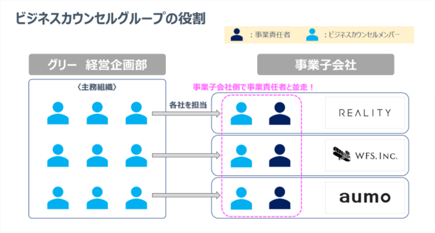そこから、改めてビジネスカウンセルグループを組成しグリーの経営企画部の下に組織化し、今の形をとるようになりました。そうすることで、ビジネスカウンセルで経営者と同じ視点で事業を見て、判断し、事業をグロースさせることで、次の事業責任者になるというキャリアも描けますし、他方でもっと財務戦略的な部分を尖らせたキャリアを進みたいということであれば、経営企画部の中での異動やもちろん他コーポレートのキャリアを形作ることもできます。