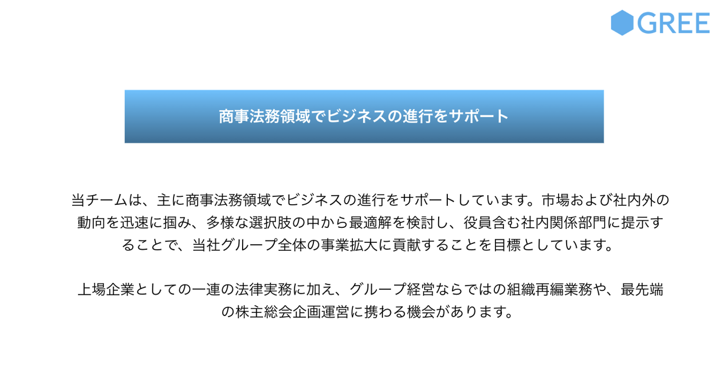 グリーの組織法務は法務総務部 組織法務グループという組織構造になっており、組織法務グループ以外にも事業法務グループ、知的財産グループ、リスクマネジメントグループなど多くのグループが存在します。