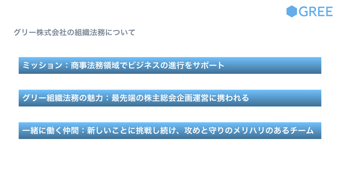 組織法務チームのミッションは、主に商事法務領域でビジネスの進行をサポートすることです。業務は大きく3つに分かれており、グリーのミッションである「インターネットを通じて、世界をより良くする。」を尊重し株主総会自体のDX推進や業界の伝統的なプロセスに対して新しいアプローチを提案などを行なっています。