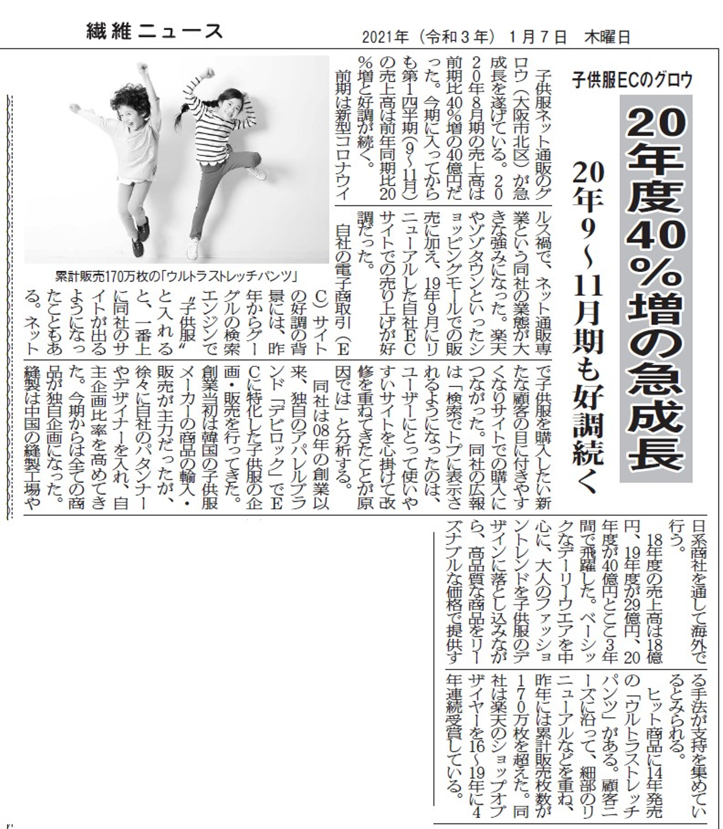 18年度の売上高は18億円、19年度が29億円、20年度が40億円とここ3年間で飛躍した。ベーシックなデーリーウエアを中心に、大人のファッショントレンドを子供服のデザインに落とし込みながら、高品質な商品をリーズナブルな価格で提供する手法が支持を集めているとみられる。