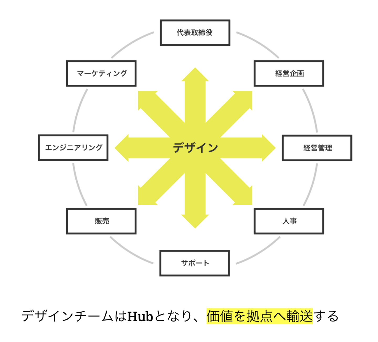 この図は、デザインが各部署に価値を提供している図ですね。この状態が理想と考えました。理由として、企業の“デザイン戦略”はあらゆる部署にデザインが行き届き、デザインの本質が理解されることで機能すると考えたからです。