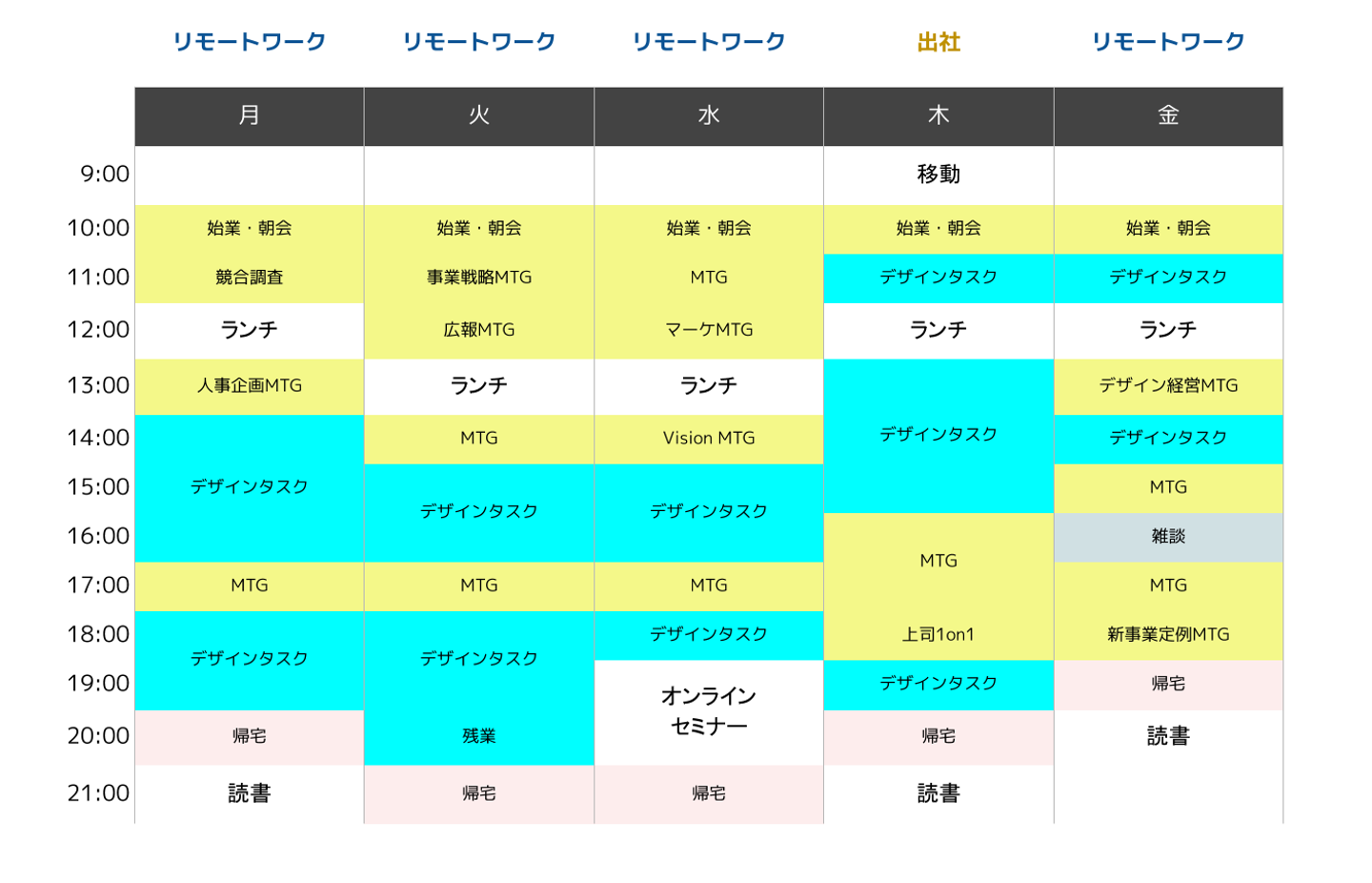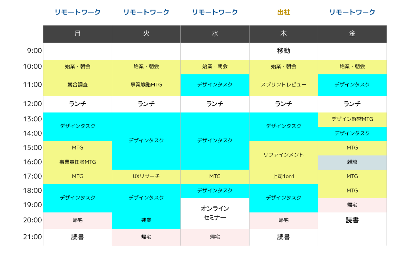 緊急事態宣言前のとある1週間の働き方はこんな感じです。月金をミーティングデー、火水木を作業デーと分けています。プロダクトデザイナーはスクラムイベントに参加しているので、開発チームとのレビューイベントなどが定期的にあります。