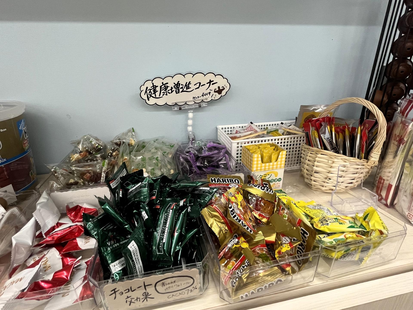 軽食、自動販売機の飲み物・アイスなど無料:グループ会社の福利厚生で弊社も利用しています。打ち合わせの合間にも手軽に利用でき、お腹と心を満たすことで、仕事の効率を上げるために設置されました。社員が健康に楽しめるよう、ロカボ商品や季節、新作に合わせて内容が変わります。アイスは1日2個まで、と健康を考えたユニークなルールもあります笑