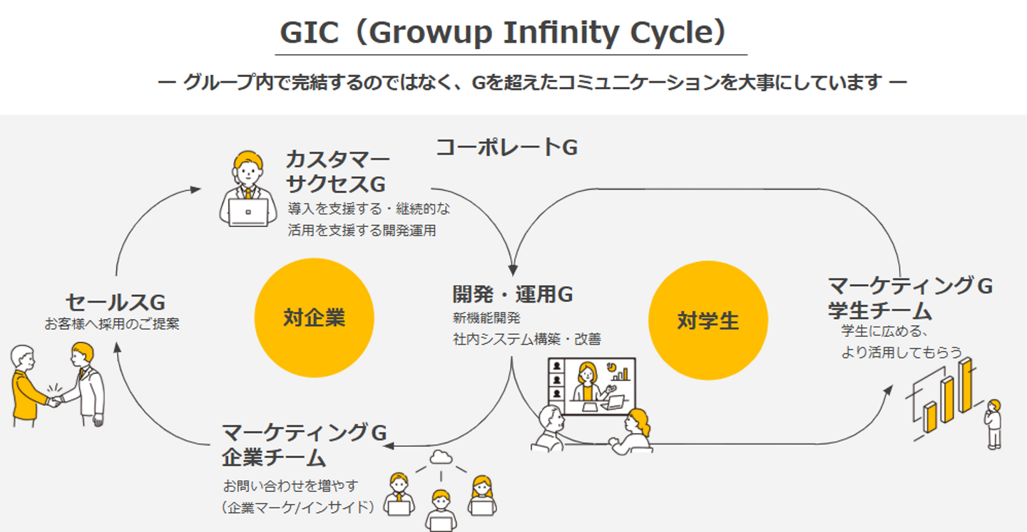 ランチコミュニケーション:他グループとのコミュニケーションを活性化することで、高速で改善につなげ、開発、企画、提案などに活かすための制度。弊社ではこのサイクルをGIC(Growup Infinity Cycle)と呼んでいます。毎月2回まで社員同士で日程やお店を決めランチにいきます。