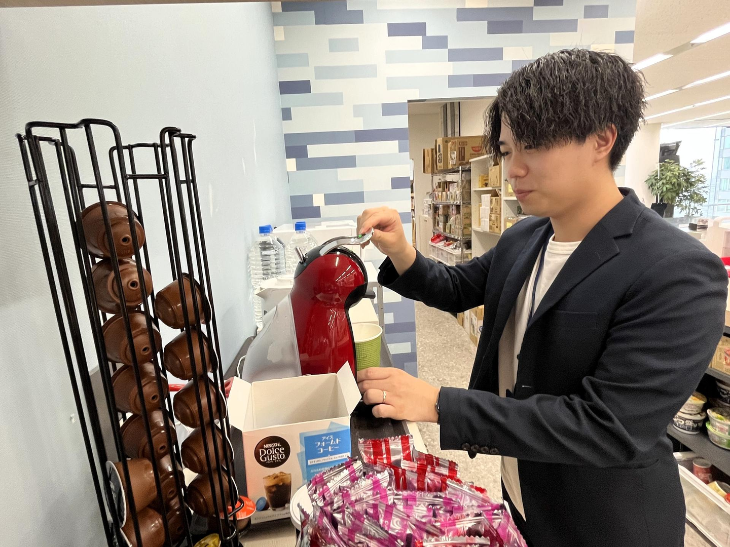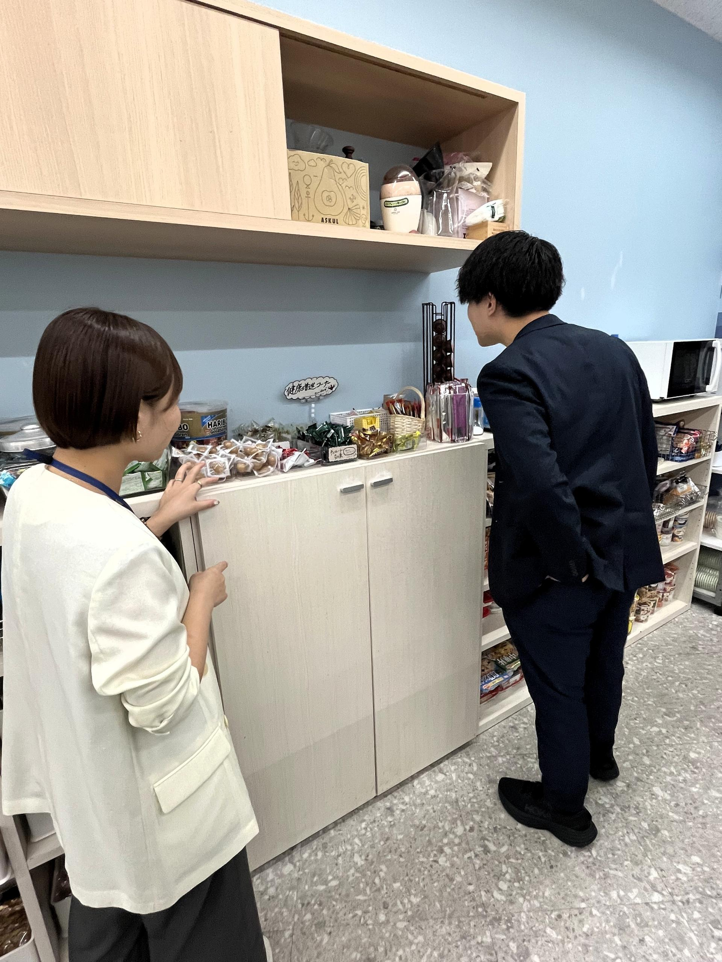小関:私のお気に入りはじゃがりこです!笑 あと健康増進コーナーも好きです!高カカオチョコやビタミン錠剤、プルーン、ナッツなどがあります。コーヒーマシーンもあるので、それを利用して夏は氷を入れてアイス、冬はそのままホットで飲んでいます!コーヒーが好きで1日3、4杯は飲みます。