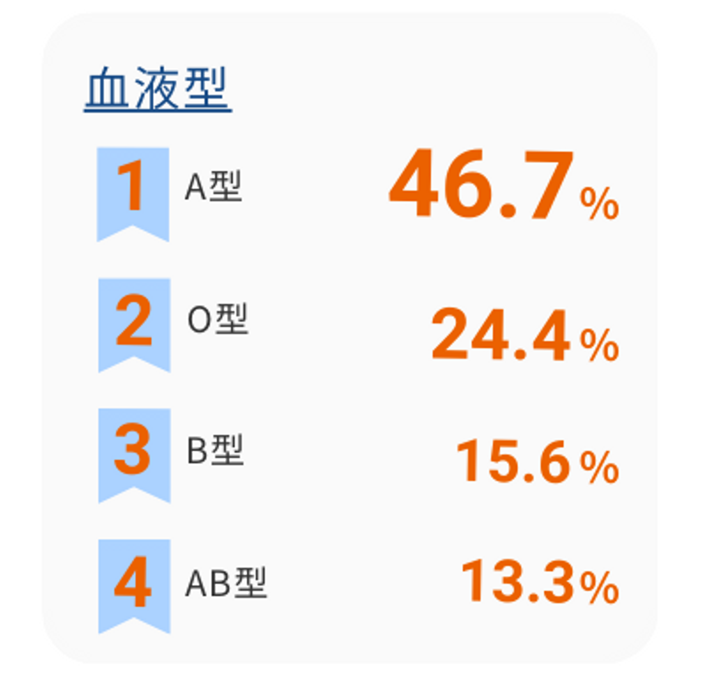 A型が約47%、O型が約24%、B型が約16%、AB型が約13%という結果になりました。