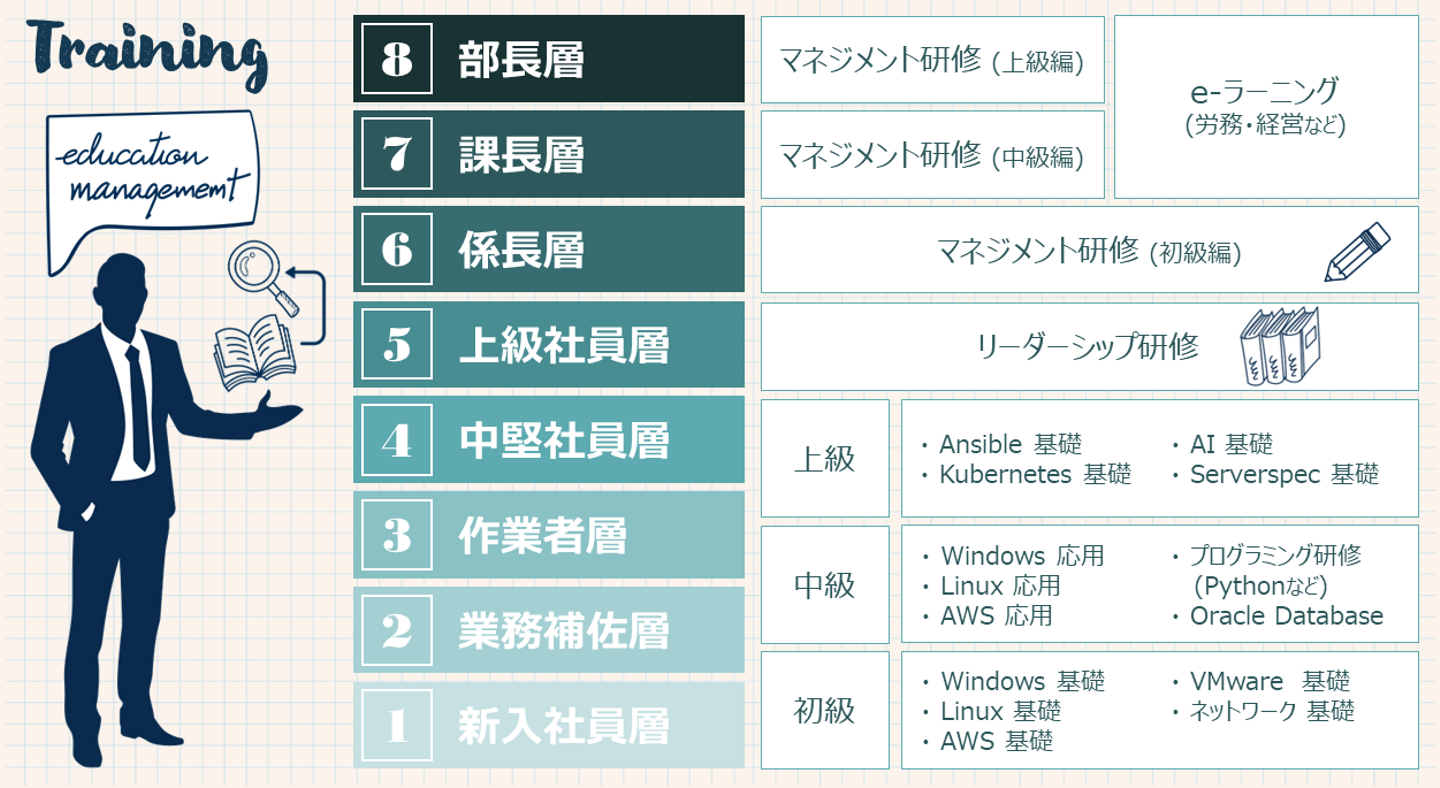 その後、Windows、Linuxなどの実務的な研修も行いながら、案件先で利用する技術を事前に学習していきます。