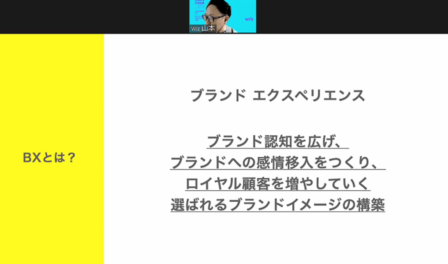 BXとはブランドエクスペリエンスの略であり、本事業部では企業やサービスの価値を高めて、ロイヤル顧客を増やしていくという取り組みを行っていきたいということが伝えられました。また、Wizの企業価値を高め、「バリューアップならWiz」という認知を拡大していくという目標が掲げられました。