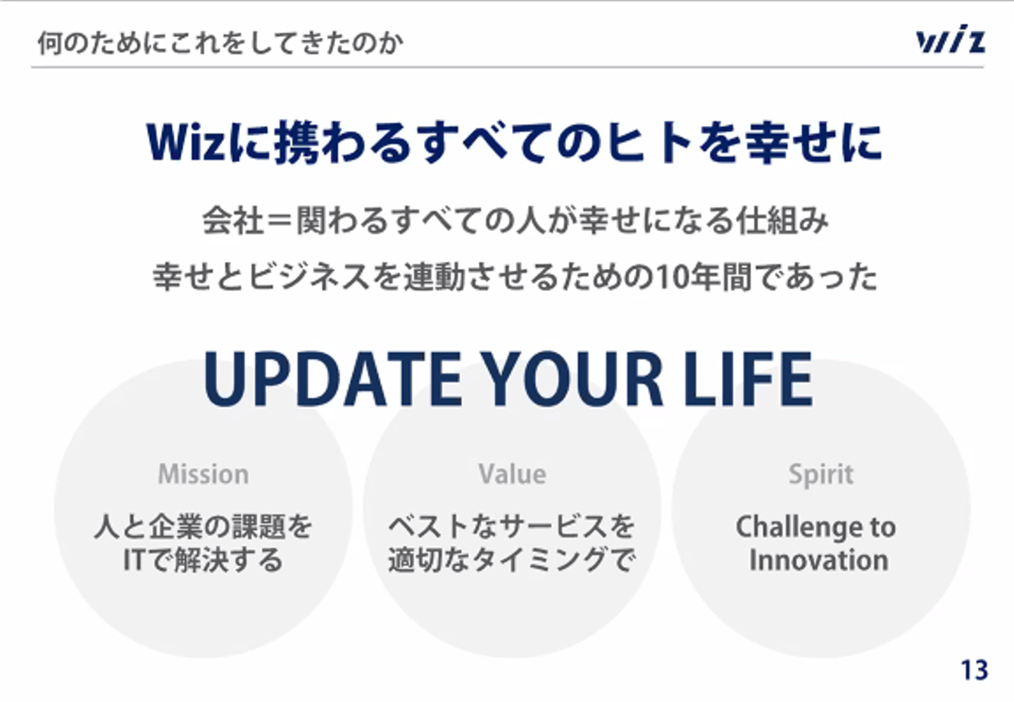まず、この10年Wizが何を行ってきたのか、何のためにしてきたのかが語られました。そして築き上げられた企業としての土台やWizのカルチャー、新設されたパーパス「UPDATE YOUR LIFE」について伝えられました。その後、幅広く展開している事業の中でも特に注力している事業の内容や今後の展望、グループ会社の展開などについて説明がなされました。