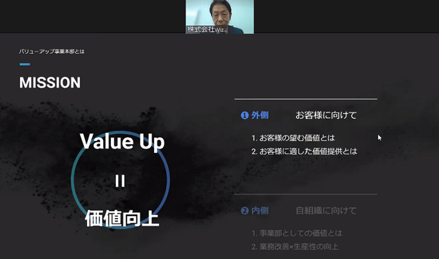 初めにバリューアップ事業部は、お客様に向け・自組織向けの2軸で、「バリューアップ=価値向上」を目指しているという説明がなされました。お客様向けのバリューアップとして、お客様に一過性の利益ではなく継続的な利益が出るよう、業務改善・生産性向上を明確に提案し、お客様の望む価値を提供することを目指すと伝えられました。また、自組織向けとしては、付加価値を生み出せる組織・成長が明確に表れている状況であることがその組織の価値であるという説明がなされました。