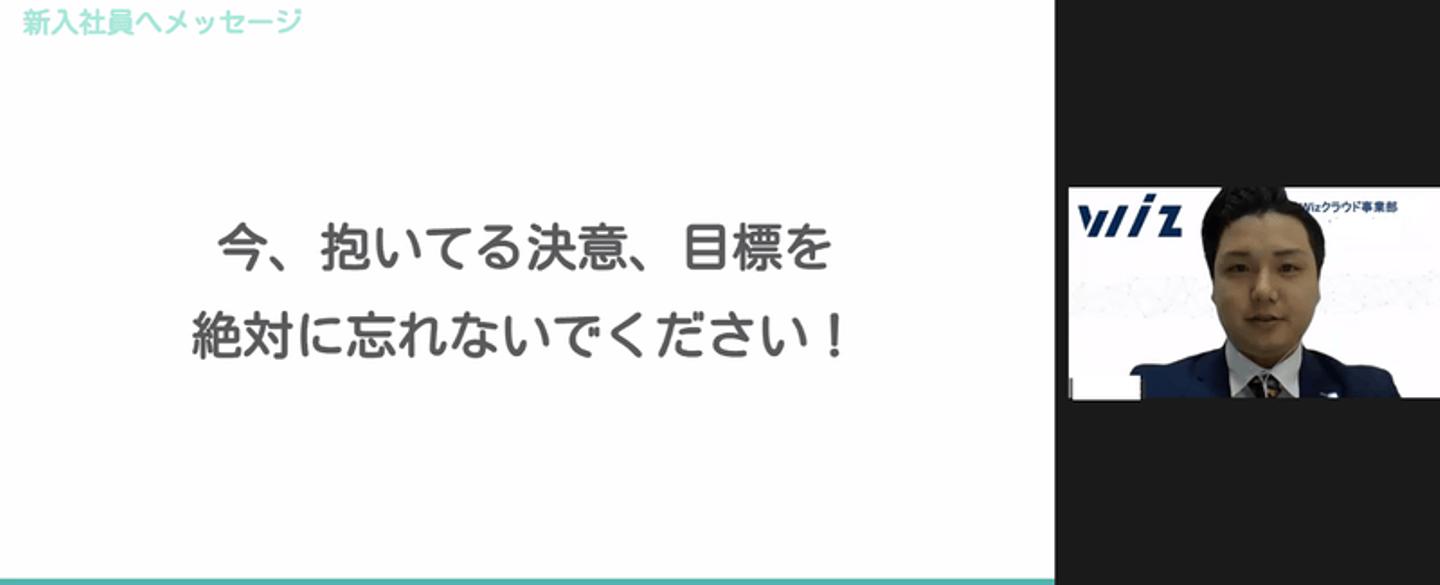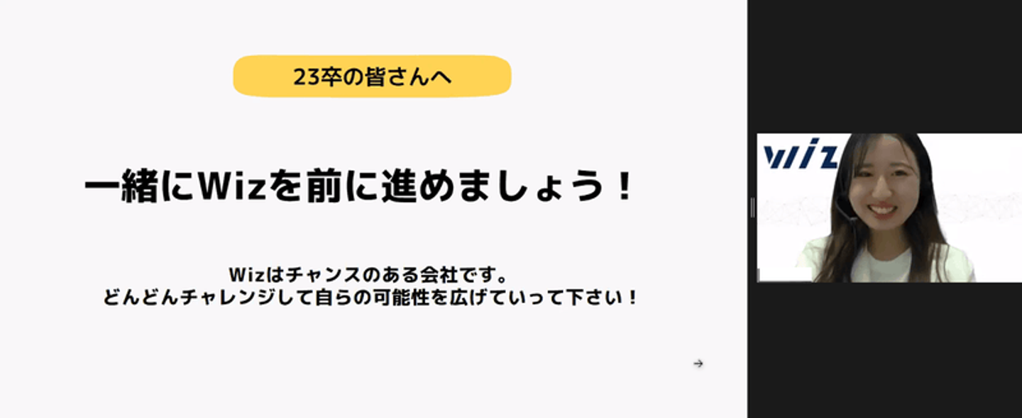 「新入社員の皆さんにはぜひWizという環境をフルに使い倒して、幸せになってもらいたいです。この中にいる皆さんも、先ほどの先輩スピーチで登壇した先輩社員のように成長してくれると思います。皆さんの成長がWizの未来を明るくしてくれると考えています。私も頑張りますのでこれからよろしくお願いします!」