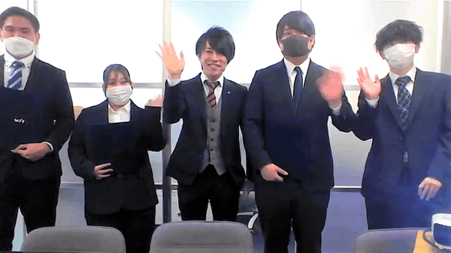 全国にある各支社をオンラインで繋ぐ形で開始した入社式。オープニングムービーではインターン中のメンバーの様子が映し出される場面も!その後、取締役5名からの祝辞、辞令交付、社長祝辞と進みます。