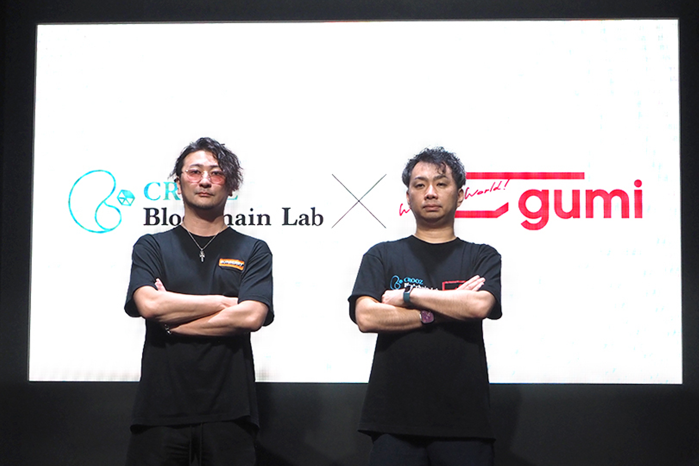 合同記者発表会では、CROOZ Blockchain Lab株式会社の古瀬祥一代表取締役社長、gumiの森田が特設ステージに登壇。古瀬氏は、共同出展に至った経緯について「既存のゲームユーザーでも楽しく遊べるゲームを作り、そこにWeb3要素を入れて、Web2.5のような立ち位置のゲームを作ろうと考えていた。gumi社も同じアプローチで作ろうとしていると聞いたことでメジャーゲームに匹敵する大きさで2社で手を組み大きくやろうとなった」と話しました。