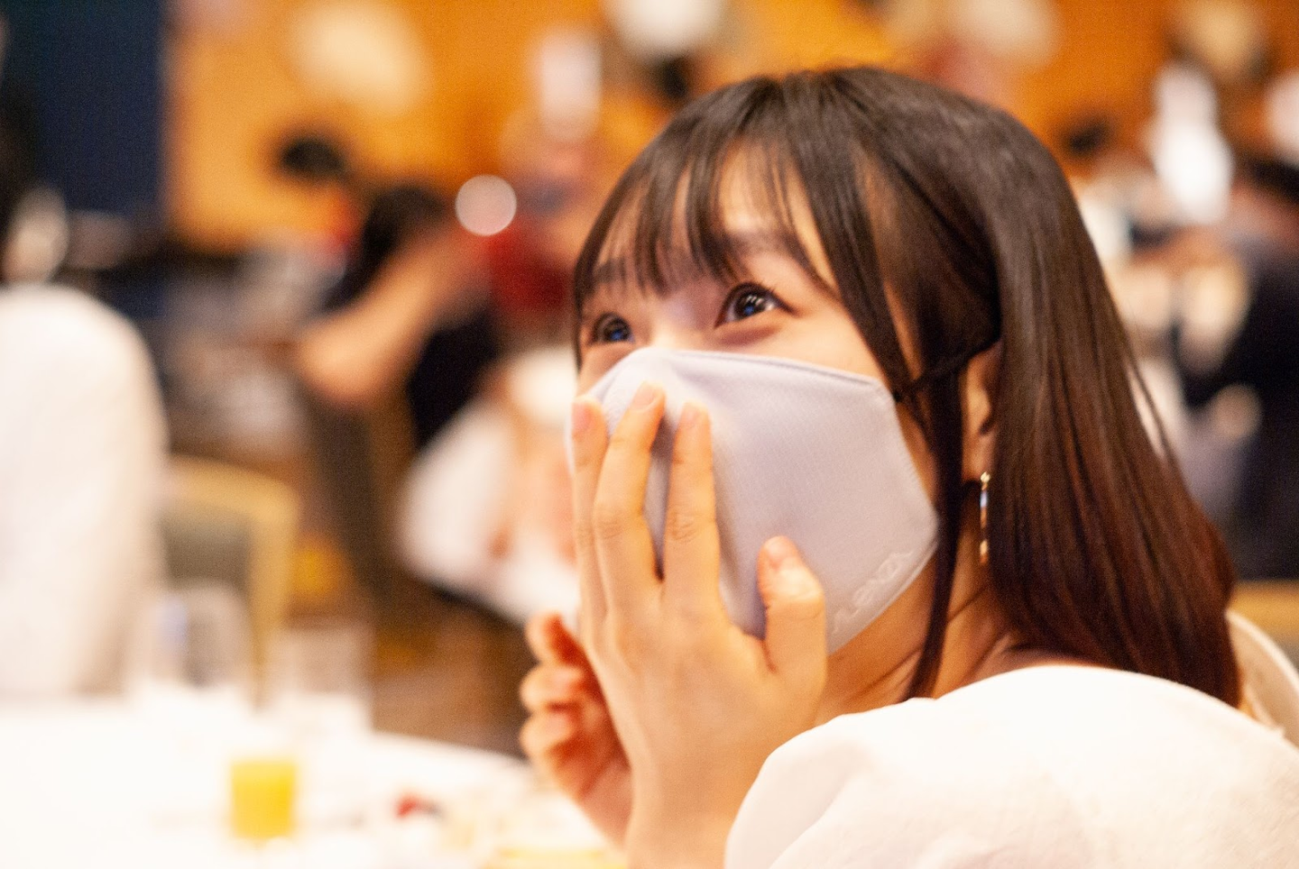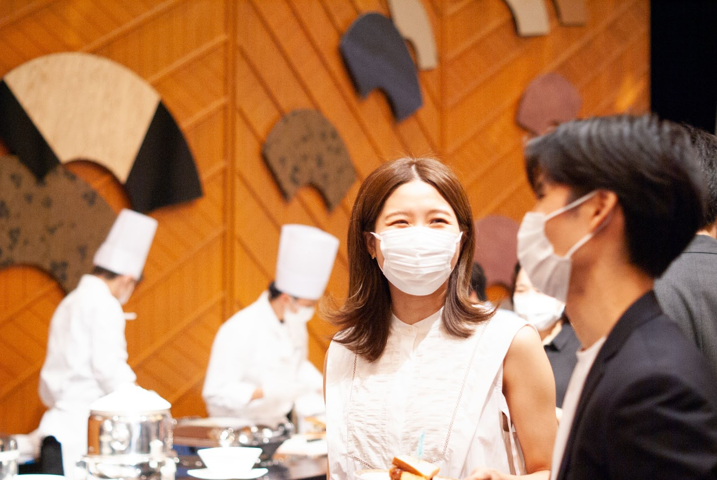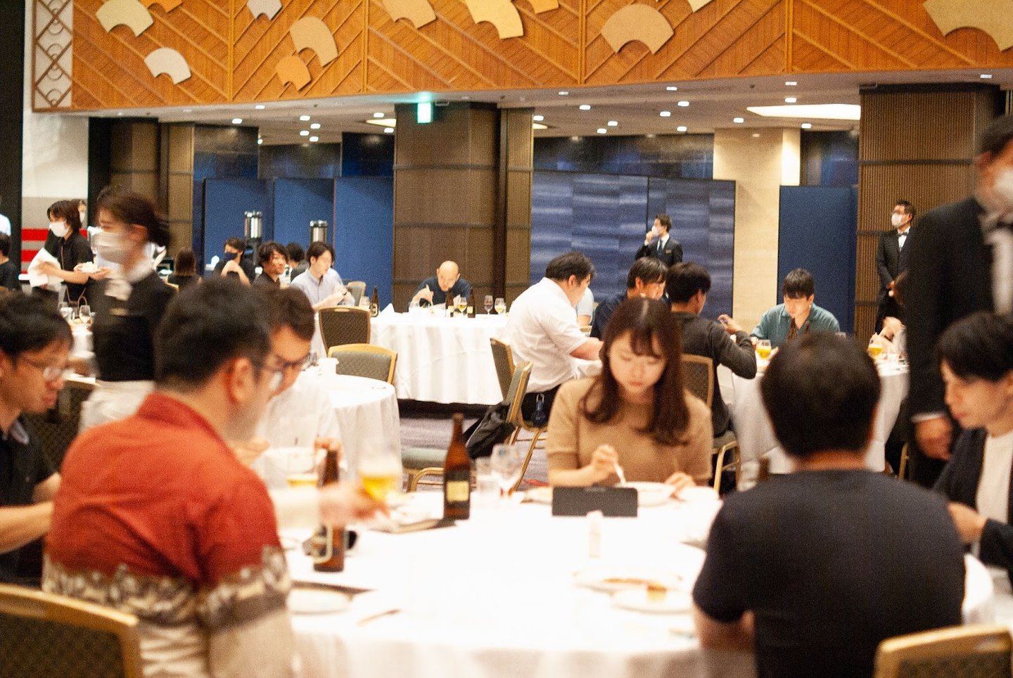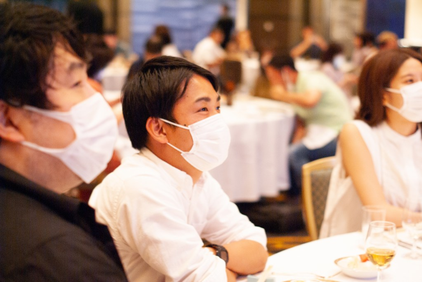 *コロナ感染状況を考慮して、感染対策は会場側と相談のうえ万全を期しております。参加は任意とし、社員のおよそ半分がオンラインでの参加となりました。また、席次は事業継続性を考慮し同チームからは2名を上限とし、チームを分散した席次としております。飲食時および集合写真の撮影時のみ、マスクの着用を外しております。