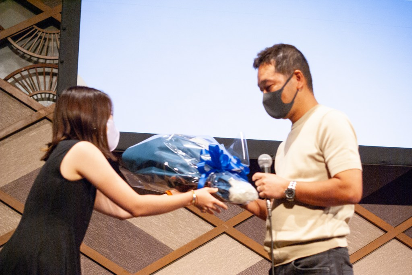 役員コーナーが終わると司会から「木村さんだけ残ってください」の声。なにかはじまるのか?とステージに注目が集まる中、壇上の木村さんに花束とケーキが。そう、締め会の翌日は木村さんのお誕生日なのでした。会場からは盛大な拍手が送られます。