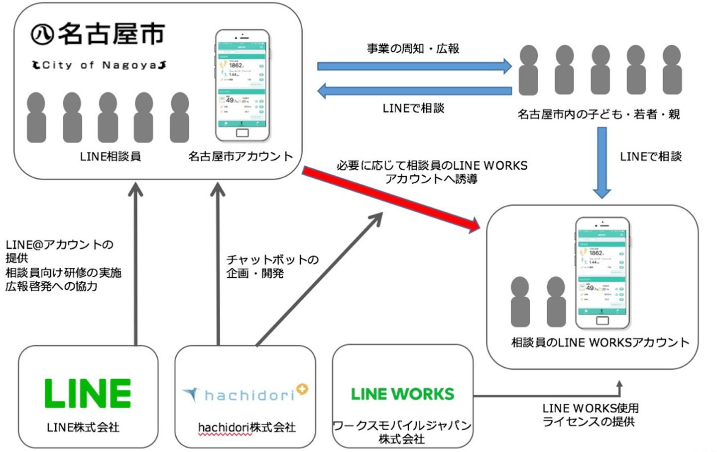 さて、本日名古屋市にて、hachidori・名古屋市・LINE・ワークスモバイルジャパンの4者間で『子ども・若者・親と相談員が繋がるLINEを利用した相談等に関する連携協定』を締結させていただきました。