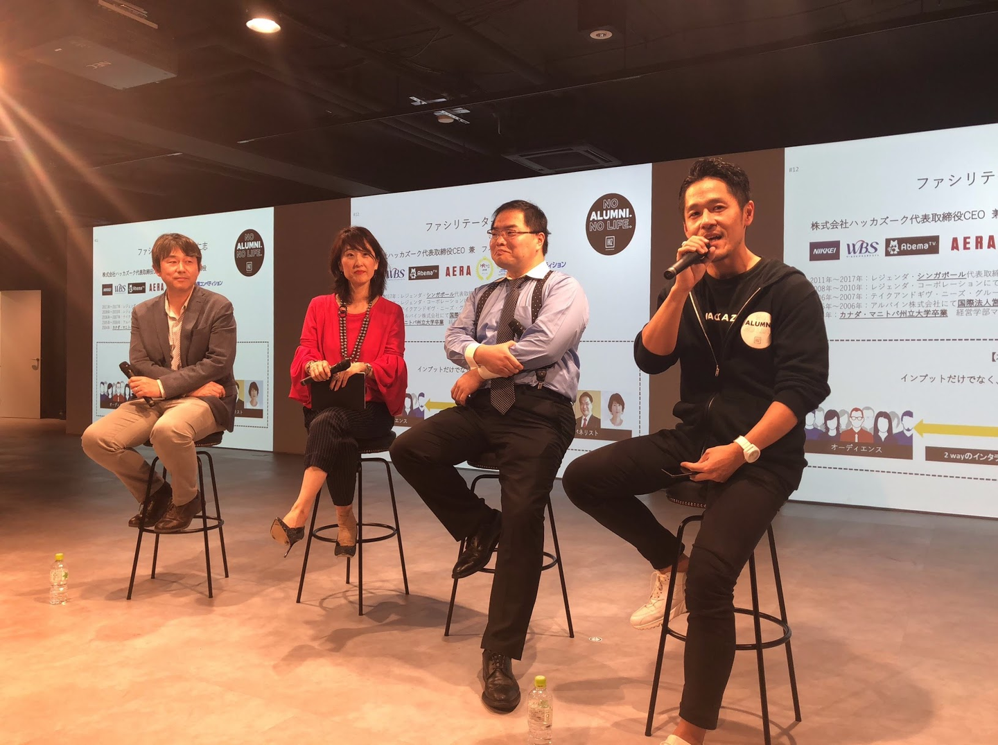 モデレーターの鈴木は「No Alumni, No Life」パーカーを着て登場。鈴木がパネリスト3名それぞれの強みを引き出し、採用だけにとどまらず、採用後の人材育成などにも話が及びました。
