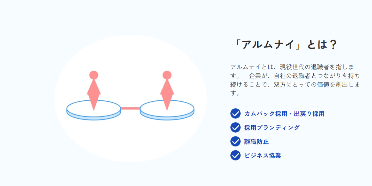 個人的に、今いる社員をどう良くしていくか、新しく採用するためにどう投資していくかを考えると、必然的にアルムナイにも投資すべきという結論に至ると思います。特に日本企業で自社以外の領域で様々な経験を社員に積ませようという流れにおいては自社の社員を外で経験を積ませるよりも、むしろ既に他社で経験を積んだアルムナイと協業する、場合によっては再入社してもらうという流れを作ることで、人的資本の観点からも強い組織になるのではないでしょうか。