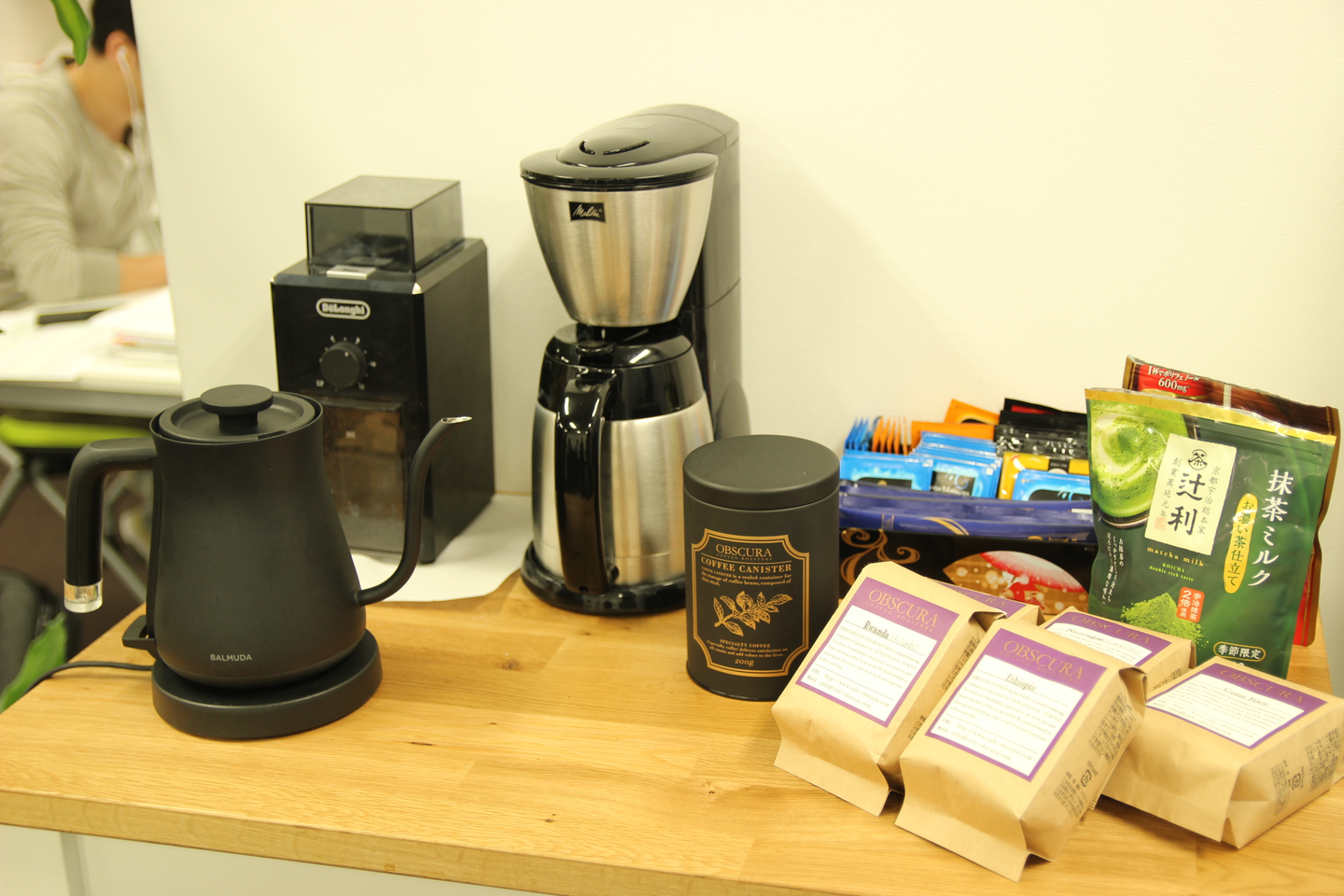 美味しいコーヒースペースも設置。新鮮な珈琲豆を毎朝オフィスで引いているので、朝はいつもコーヒーのいい香りでいっぱいです。