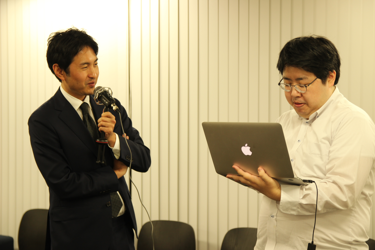 今日話す内容やスライドについて打ち合わせ中の、(なぜかニヤついた)CEO佐々木とエンジニアのぶさん。