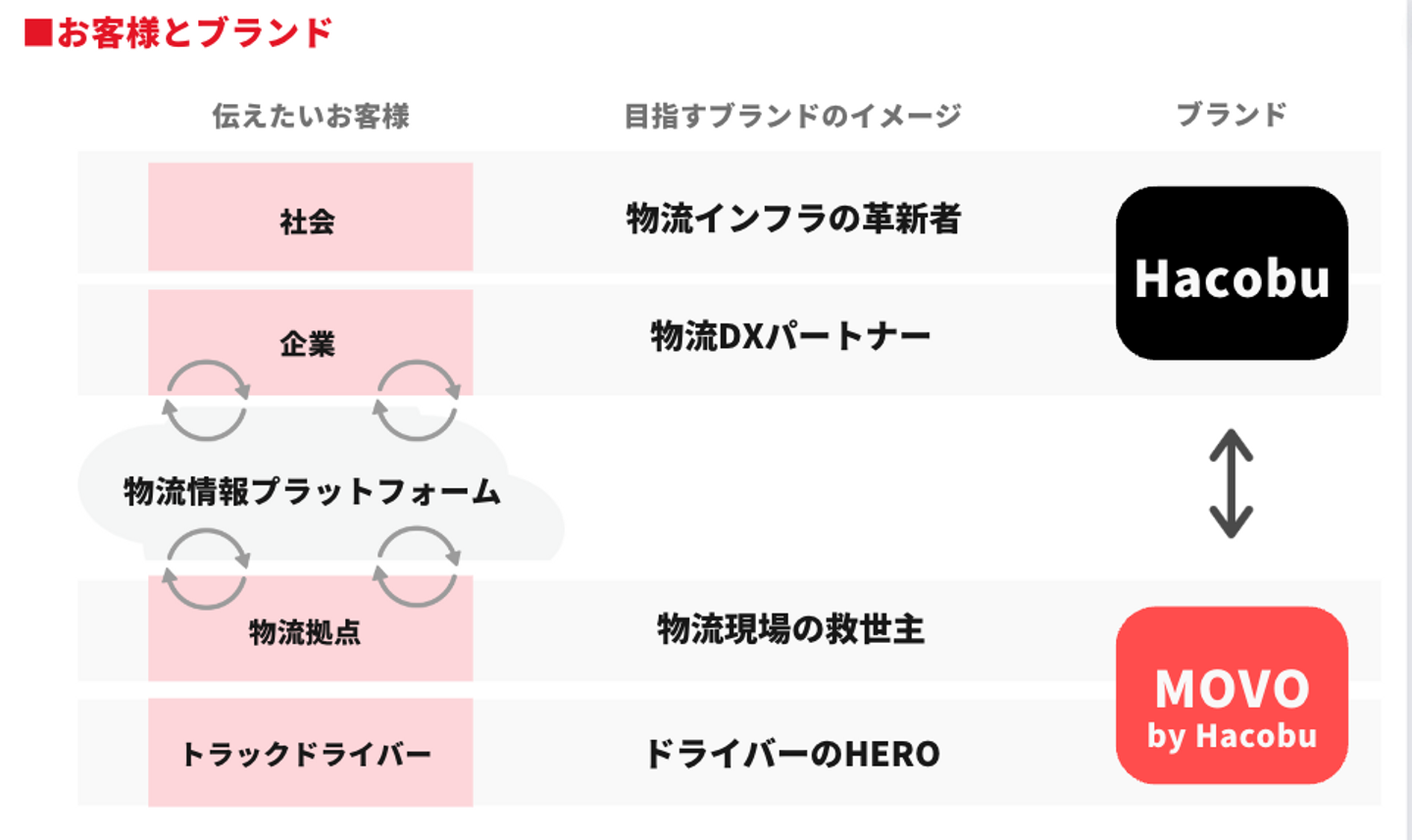 「運ぶを最適化する」というミッションは根幹に置きつつも、SaaSの開発・提供や、物流DXコンサルティング事業にとどまらず、新しい事業にも挑戦したいという決意が固まりました。その時にお客様にとってのHacobu・MOVOというブランドはどうあるべきなのか、という発想で、ブランド戦略を固めていきました。![]()