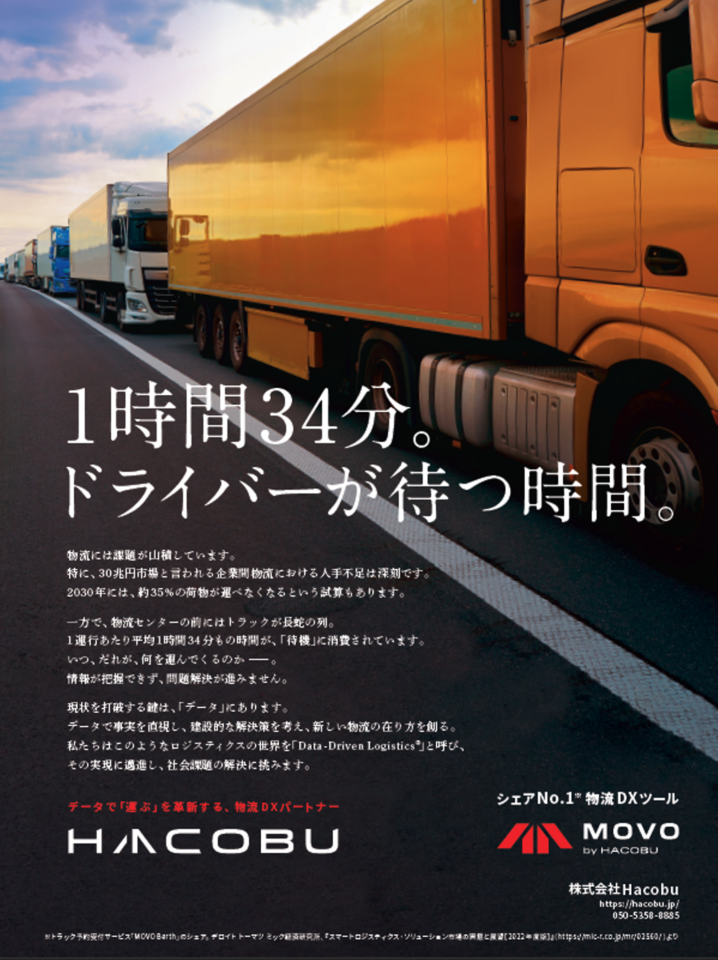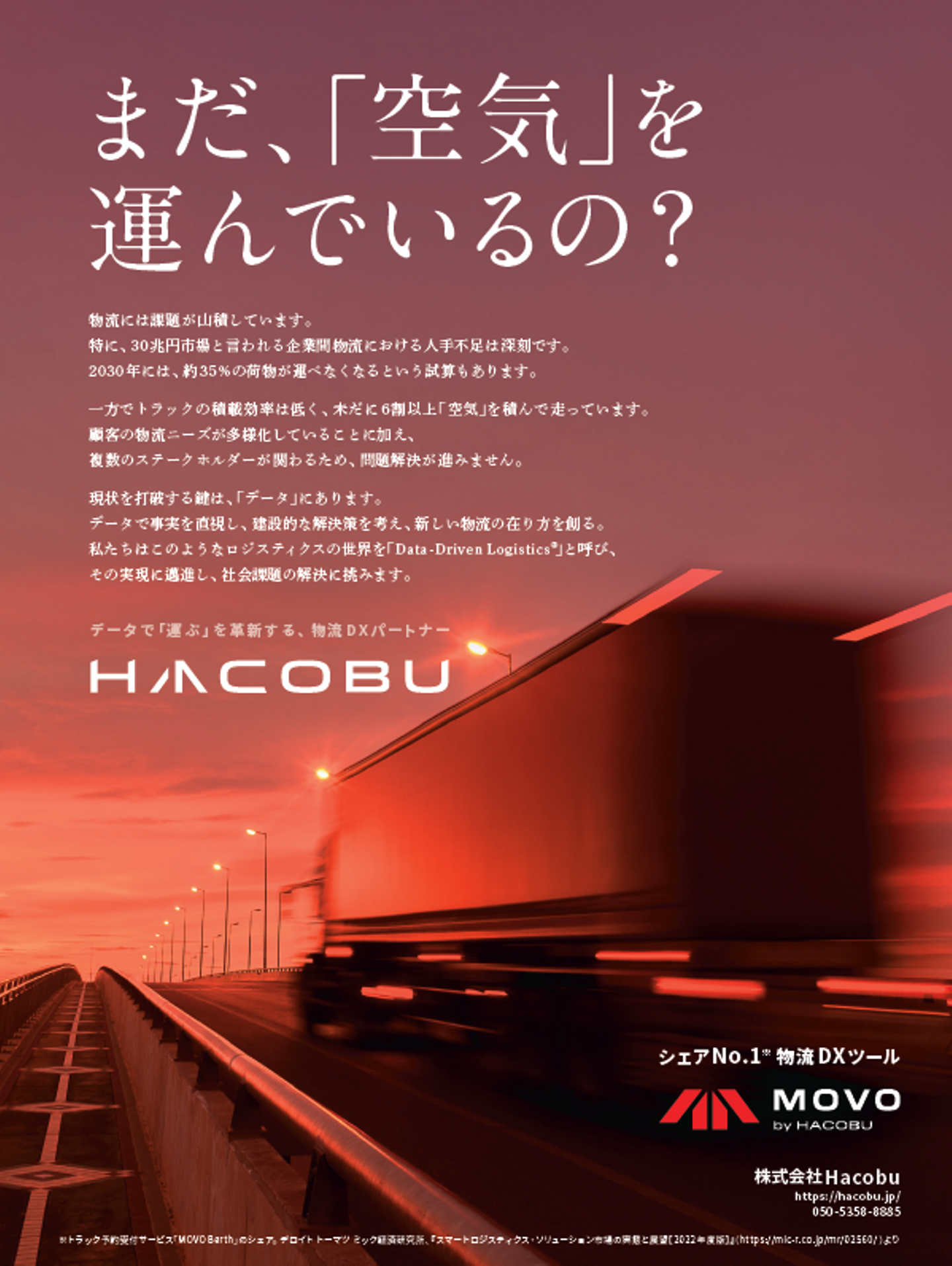 Hacobuの純広告やWebサイト。物流の社会課題解決を啓蒙するコンテンツとしている