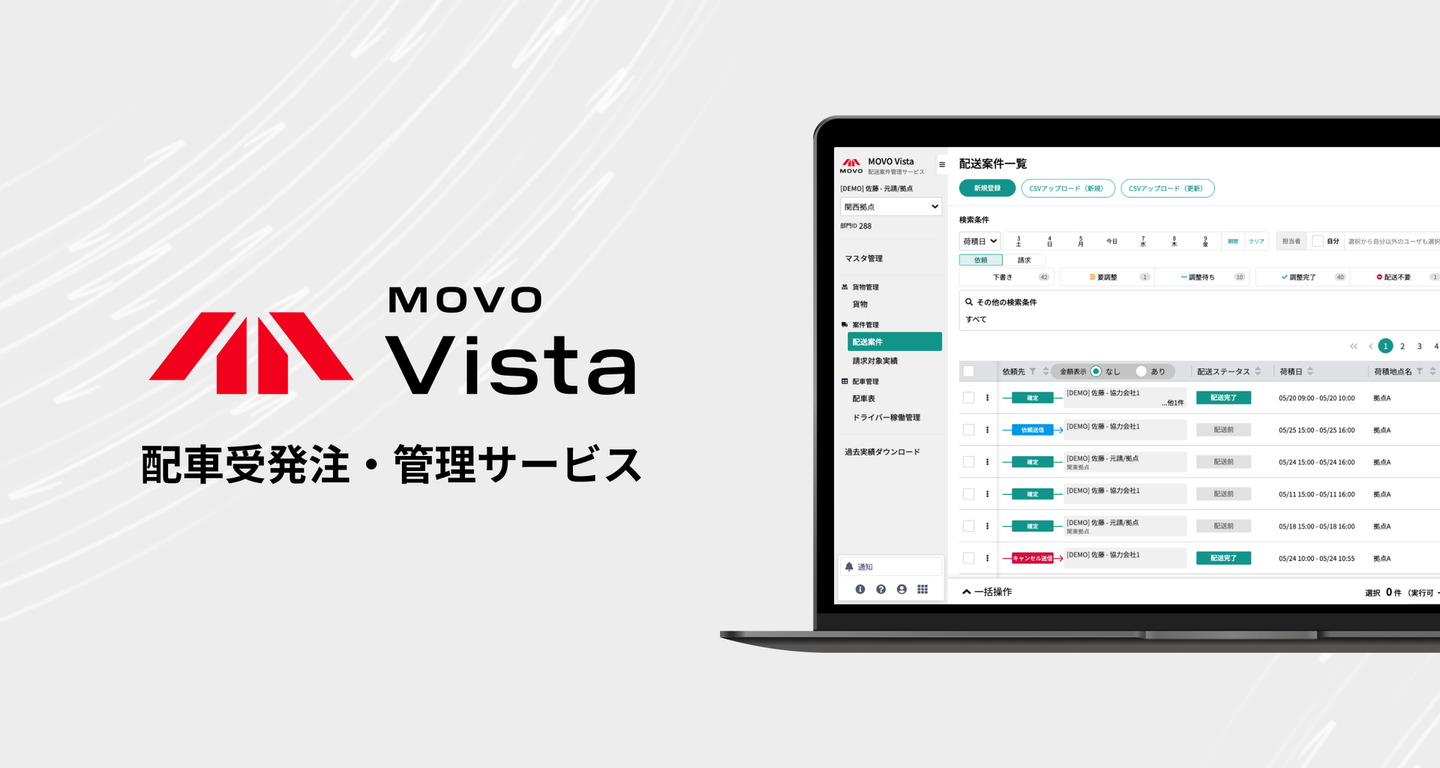 配車受発注・管理サービス「MOVO Vista」は、荷主企業・元請事業者・運送事業者の企業間をつなぎ、配送案件の管理を支援する物流DXサービスです。