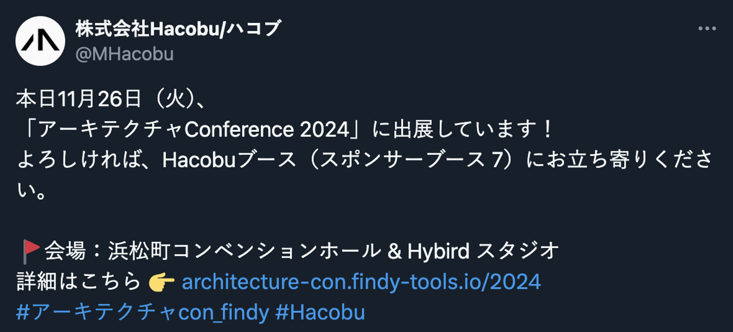 Hacobuは2024年11月26日に開催された、ファインディ株式会社が主催する「アーキテクチャConference」にシルバースポンサーとして協賛しました。