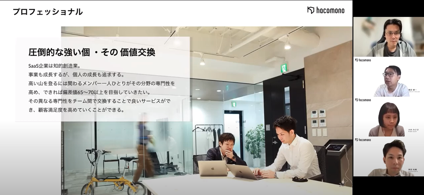 蓮田:バリューとして、2つ挙げています。一つ目はプロフェッショナル。事業としての成長はもちろんですが、個人が成長できるチーム作りを進めたいと考えています。