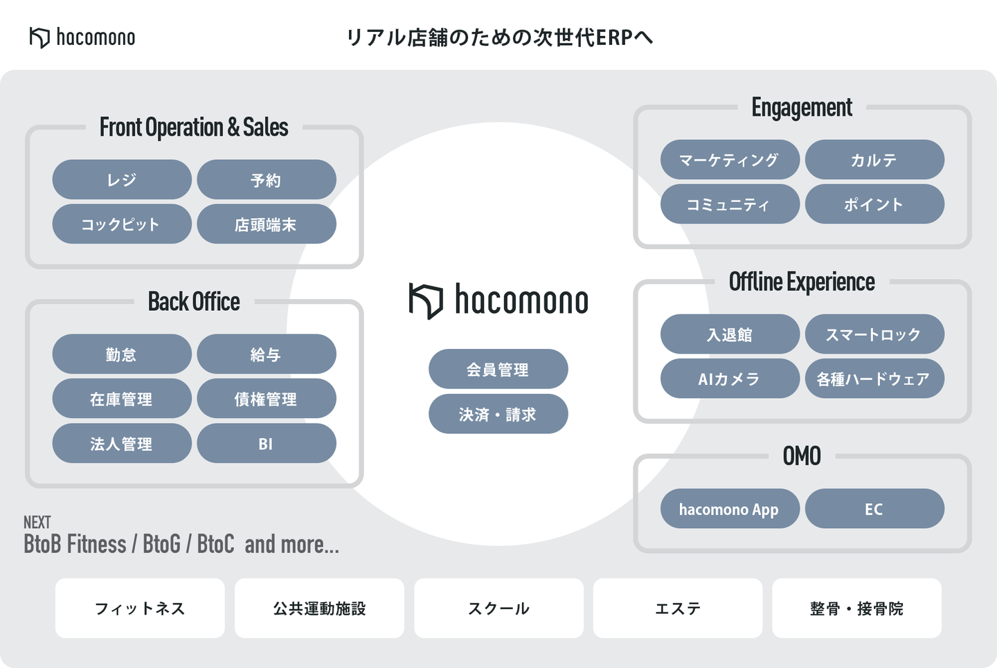ビジネスを成功に導き、ウェルネス業界をさらに発展させていくために、hacomonoはリアル店舗・サービス業における「次世代ERP」を目指していきます。