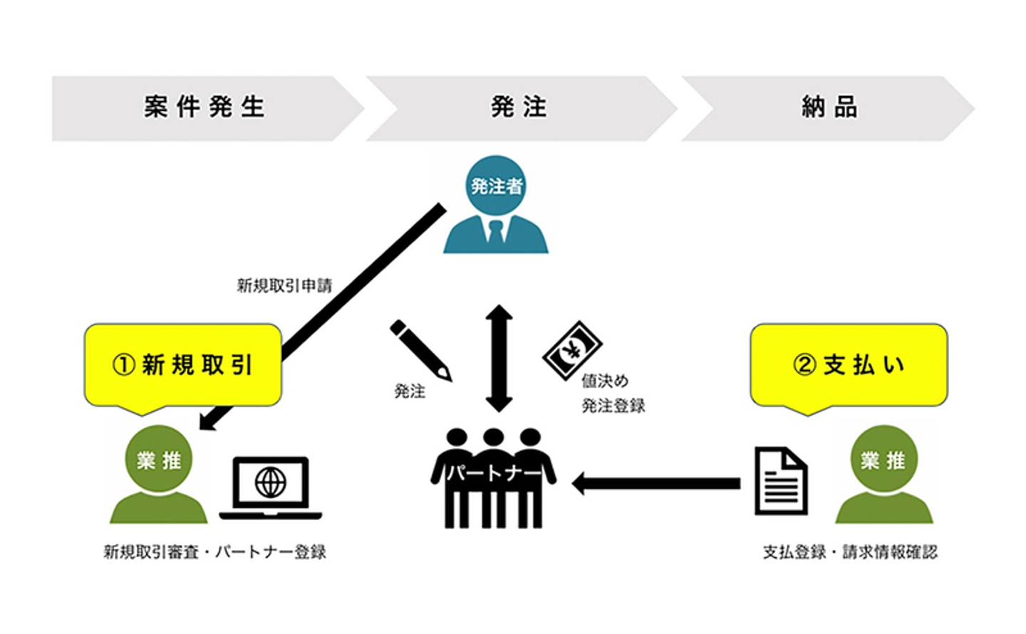 八巻「このチームでは主に、パートナーさんの新規取引時の手続きと、支払登録と請求情報確認を行っています。「新規取引手続き」は、案件発生時に新しく取引するパートナーさんがいた場合に、発注者から新規取引申請が来て、反社チェックや財務与信という審査を行い、NESTAにマスタとして登録することです。この手続きをしてはじめて発注者がパートナーさんへ発注をすることができます。「支払登録」は支払の情報をNESTAに登録することで、「請求情報確認」はパートナーさんへ納品書兼請求書を送付したり、請求書と発注登録に相違がないかのチェックをして、経理に振込作業をしてもらう為の準備をすることです」