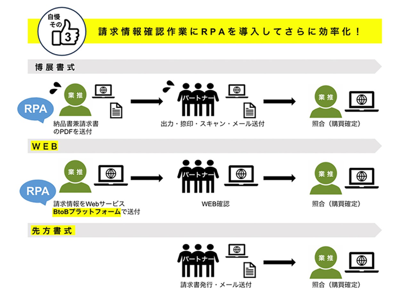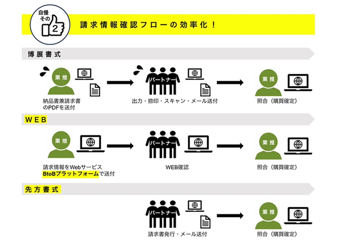 笠原「請求情報を確認する方法は、「博展書式」「先方書式」「WEB」の3パターンがあります。以前は100%「博展書式」でやっていて、パートナーさんへ納品書兼請求書をpdfで送付して、返送してもらってからの処理でとても手間がかかっていたんです。それを、「先方書式」というこちらから送らず、先方に送ってもらう方法や、WEB上で請求情報が確認できる「WEB」方式に切り替えて、効率化に繋がっています」