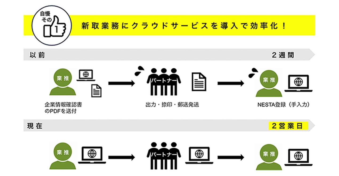 葛谷「これは八巻さんが頑張ってくれたことなんですが、パートナーさんとの書類のやりとりにクラウドサービスを導入して、回収が早くなったしすごく楽になったんです!以前は、pdfで書類を送って、先方は出力して捺印して郵送して、こちらは戻ってきたものをチコチコ手入力していたものが、今はクラウド上でポチッとすればOKで、返ってきた情報はコピペで登録できるようになったの!」