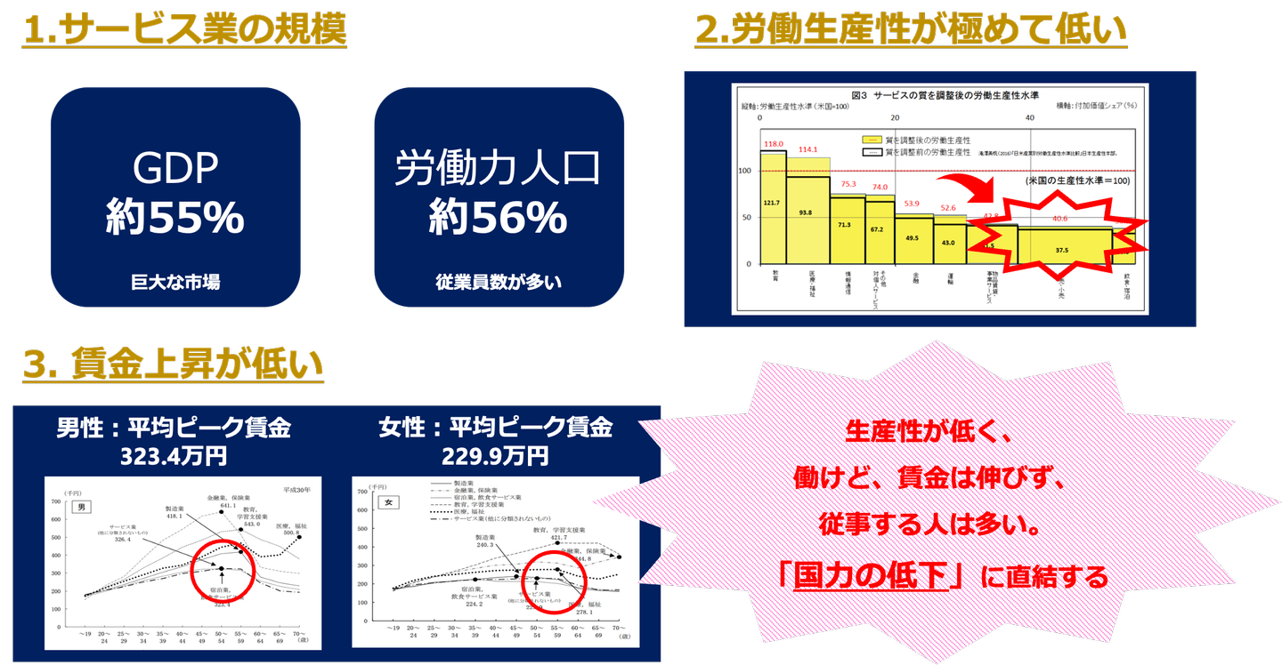 一方で、生産性が低く、業務経験が賃金に結びつきにくいため賃金上昇も他の業界と比べると低いのが現状です。日本の経済を支えているサービス産業に従事する皆様の生産性をあげ、賃金が上がる仕組みを作らなけば、それは日本の国力低下にも直結することになります。