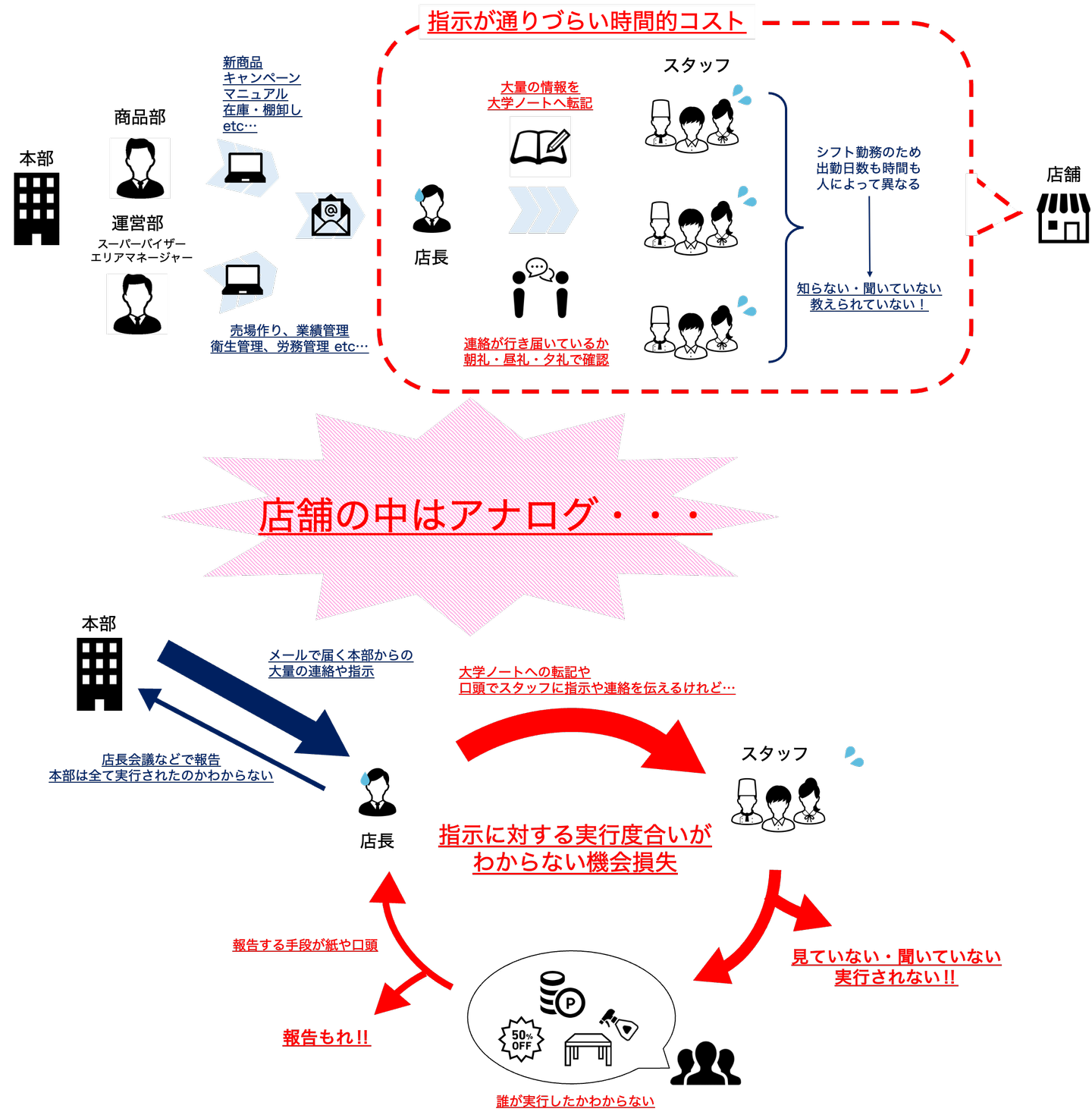 その結果、本部やSVからの指示がお店の従業員全員に行き届くためには、印刷して掲示したり、大学ノートに記入をして連絡をするしかありません。