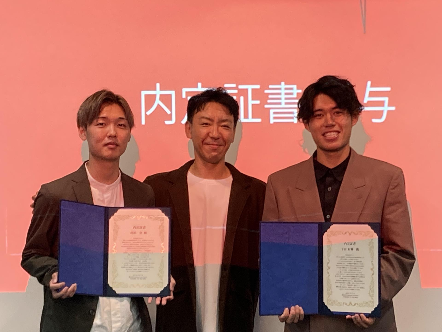 内定者が少数だからこそできる特別プログラムで、当日は内定者2名による自己紹介プレゼンと一人一人メッセージの異なる内定証書の授与、HATALUCK Tシャツとオリジナルデニムが入った「展示会参加セット」の贈呈、お祝いのケーキも登場しました。