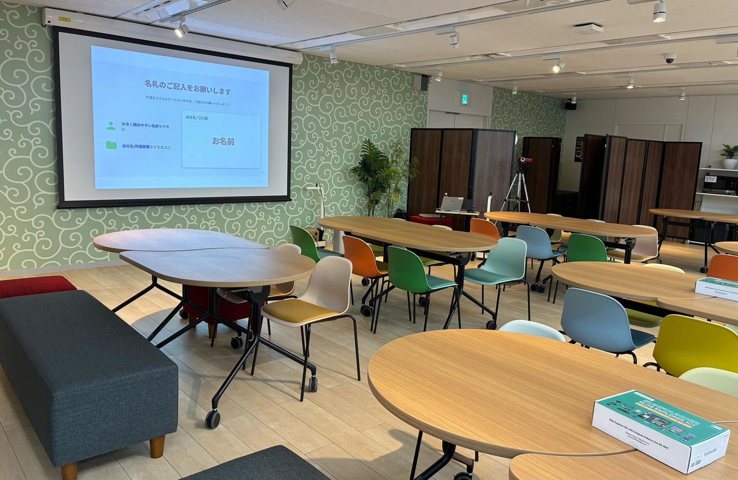 ザイマックス社内にあるからくさラウンジ。からくさ模様の壁紙がポイントで明るい雰囲気です。いつもはランチミーティングや懇親会なども行われているそうです!