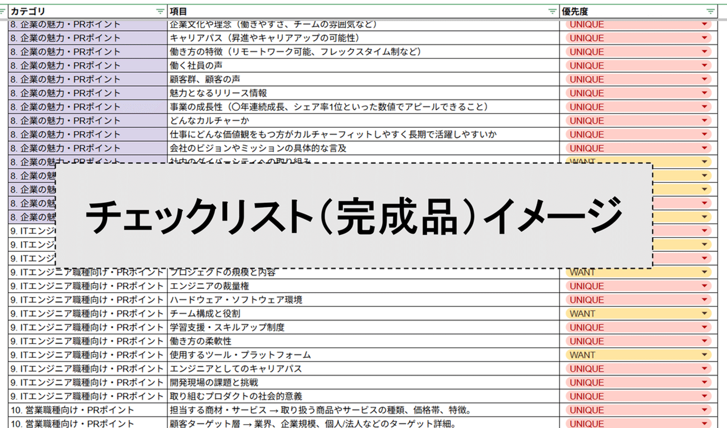 AIに「自社ならではの強み」や「企業文化」「成長支援」「社会貢献」の視点をチェックリストに追加させます。