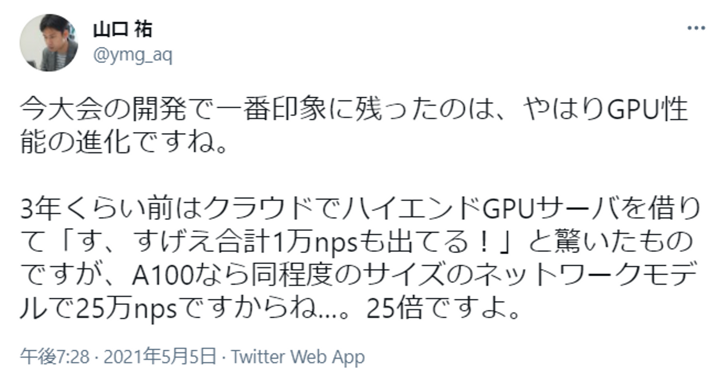 (山口さん)HEROZのデータセンターについては、将棋ソフトの強化学習の計算と、大会当日の対局サーバとして使用しました。A100については私が事前に想定していたより性能が2.5倍ほど高く、決勝進出~準優勝の原動力になりました。