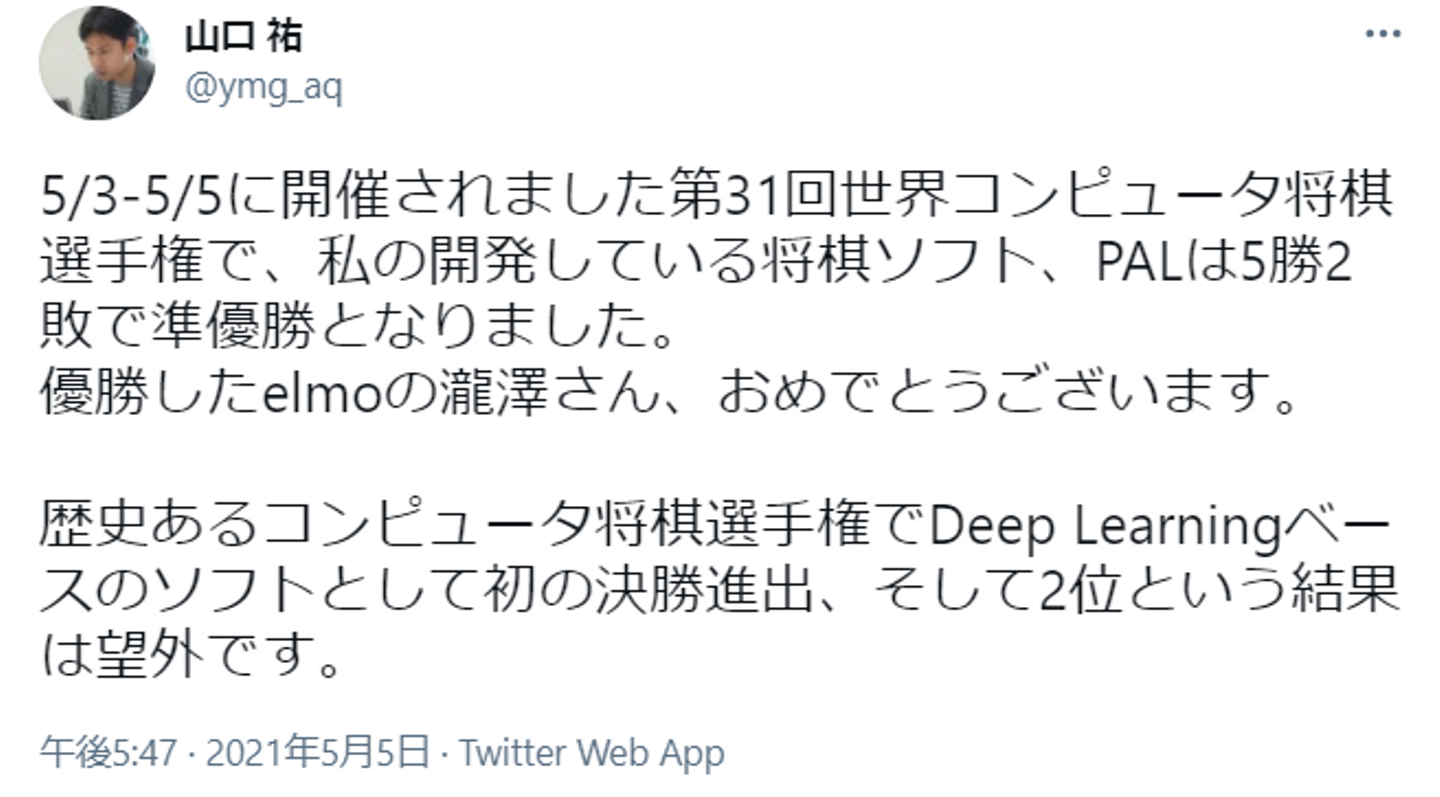 その大会において、AIエンジニア 山口祐さんが開発した「PAL」というソフトがディープラーニングベースの将棋AIソフトでは初の決勝進出、そして準優勝という素晴らしい成績を残しています!おめでとうございます👏👏
