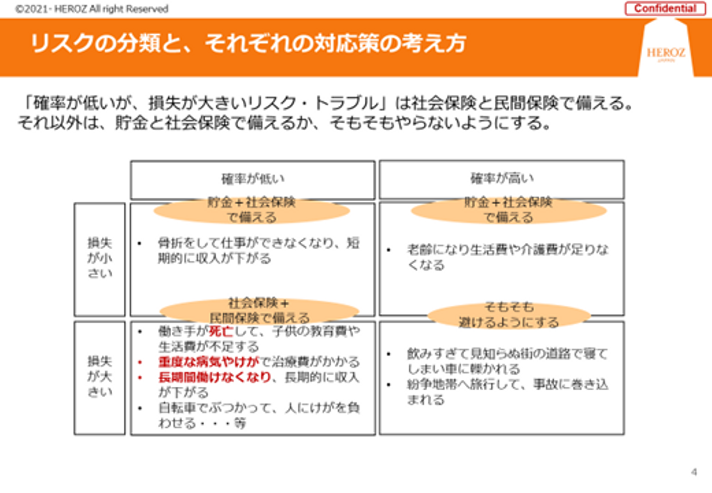 これはプロジェクトマネージャーとして活躍する、板東さんの発表の1枚。板東さんは前職、某保険会社でご活躍されており、その経験からHEROZ内「ホケンのマドグチ」として発表。もっと早く聞きたかった~!という声も。HEROZの入社すると、保険選びも安心です(笑)
