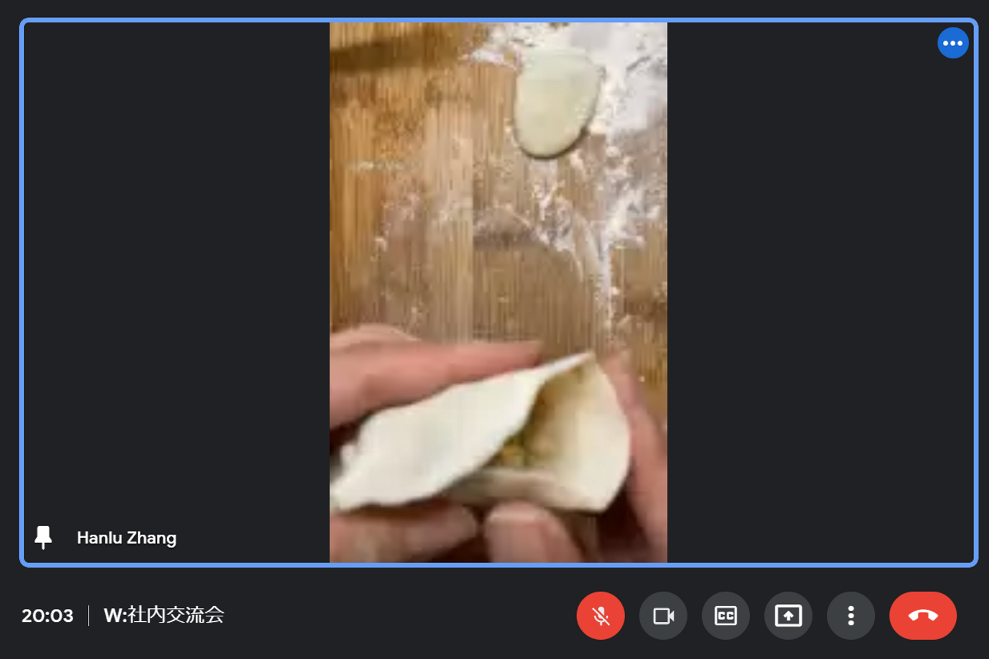 これはつい先日行われた交流会より。データサイエンティストの張さんの発表!張さんは中国のご出身で、自己紹介発表をしてくれました。発表の後半は実際に本場の餃子づくりを披露!動画系レシピサイトのオンライン配信みたいで楽しかった!・・・見ていたみんな、おなかがすいたのは言うまでもなく。