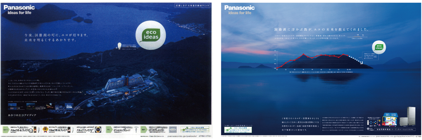 ▲(左)「今夜、洞爺湖の町に、エコが灯ります。未来を明るくするあかりです。」/(右)「洞爺湖に浮かぶ島が、エコの未来を教えてくれました。」